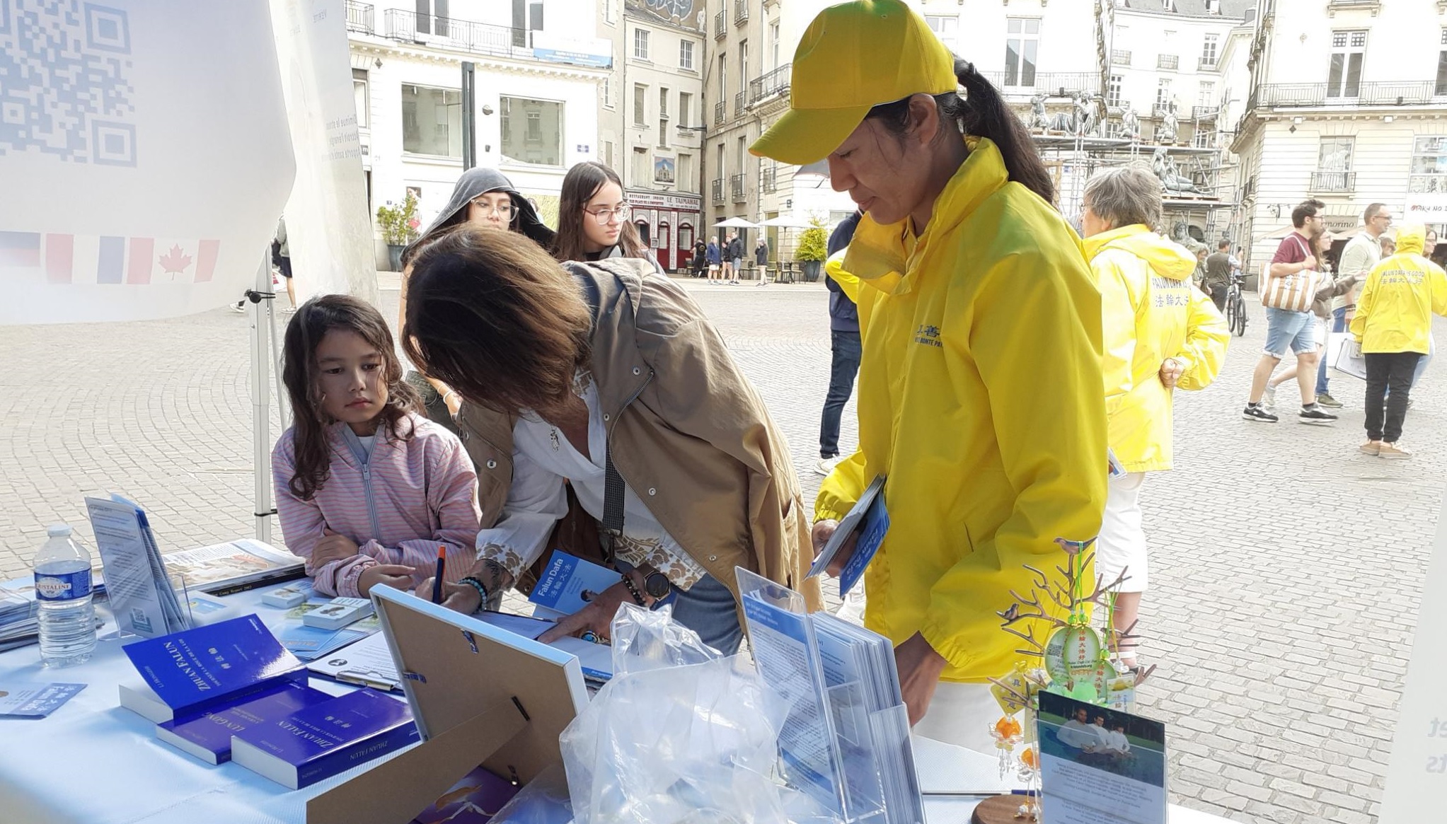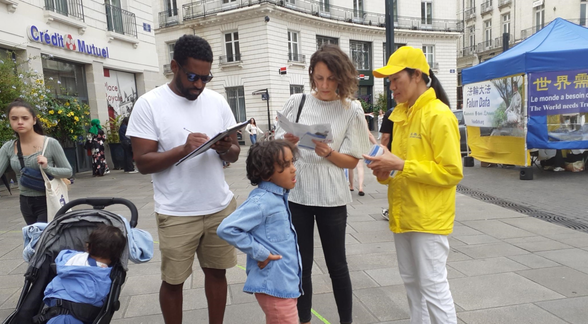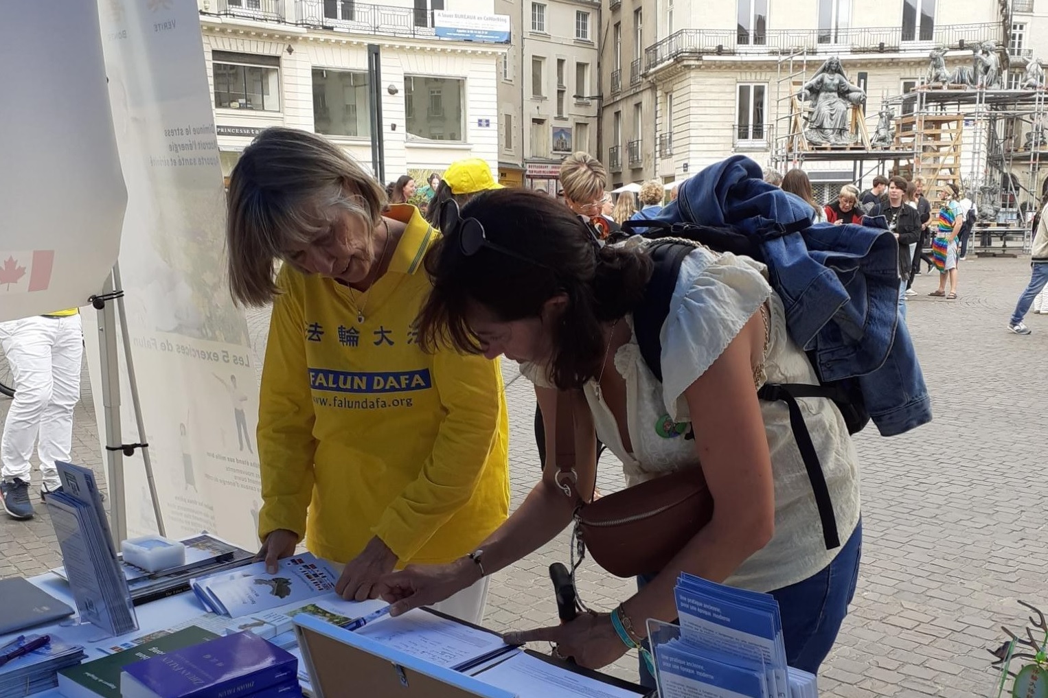 一位年轻女孩看到法轮功真相标语后,立刻打电话给她在尼斯的妈妈,告诉她在南特有一个法轮大法的展位。她签署了请愿书,并表示她的母亲是位人权工作者,也支持法轮功的反迫害。于是,法轮功学员赠送她的母亲法文版的《明慧报告:法轮功在中国大陆被迫害二十年》,这让她非常感动。