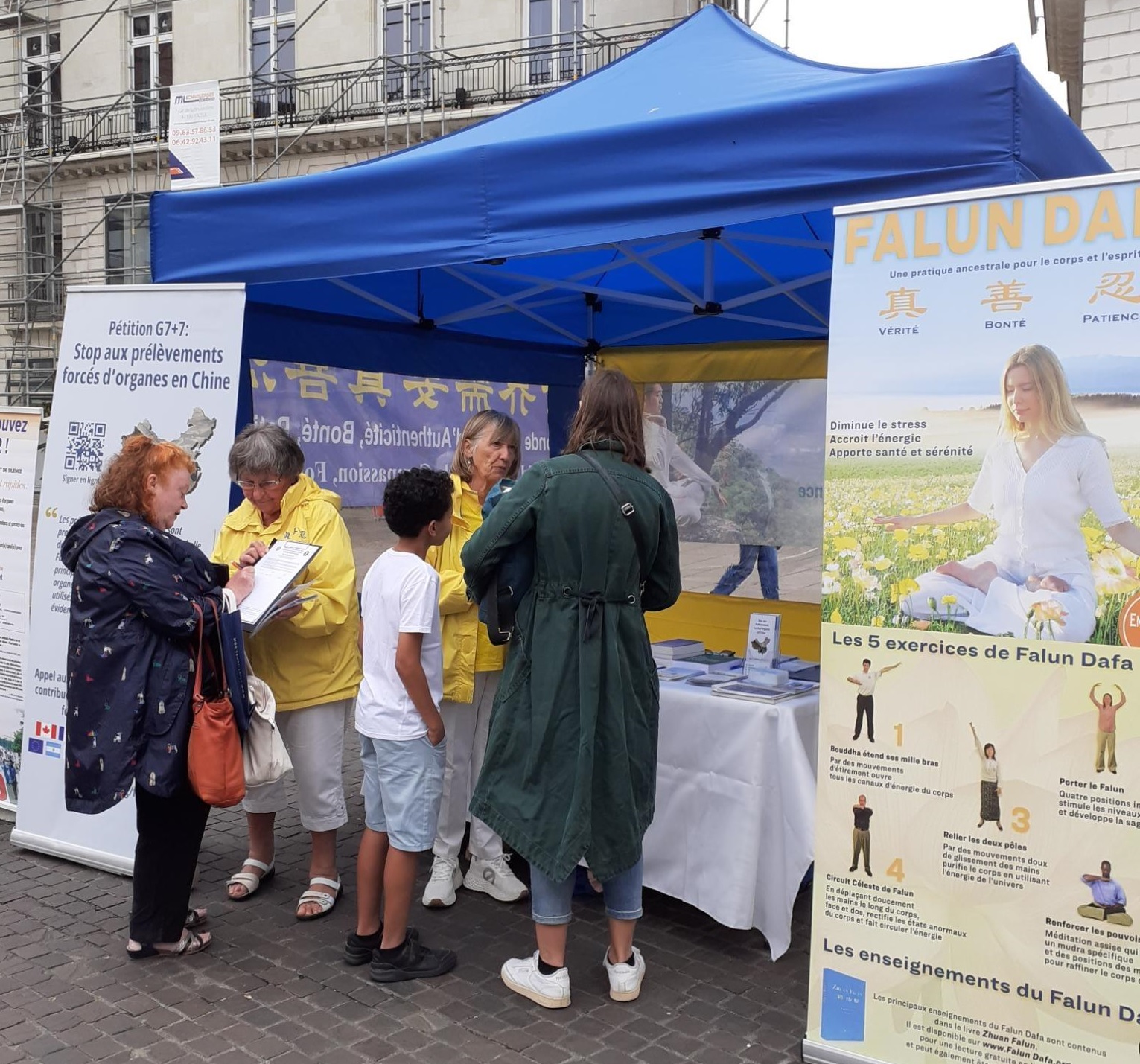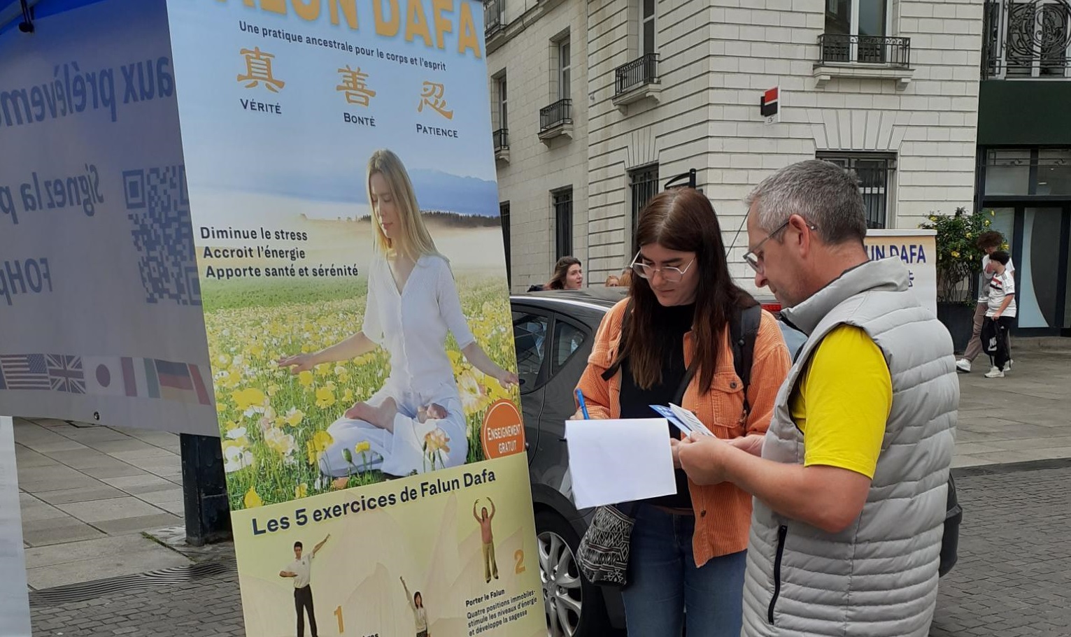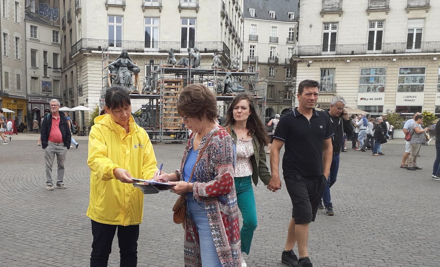 一位年轻女孩看到法轮功真相标语后,立刻打电话给她在尼斯的妈妈,告诉她在南特有一个法轮大法的展位。她签署了请愿书,并表示她的母亲是位人权工作者,也支持法轮功的反迫害。于是,法轮功学员赠送她的母亲法文版的《明慧报告:法轮功在中国大陆被迫害二十年》,这让她非常感动。