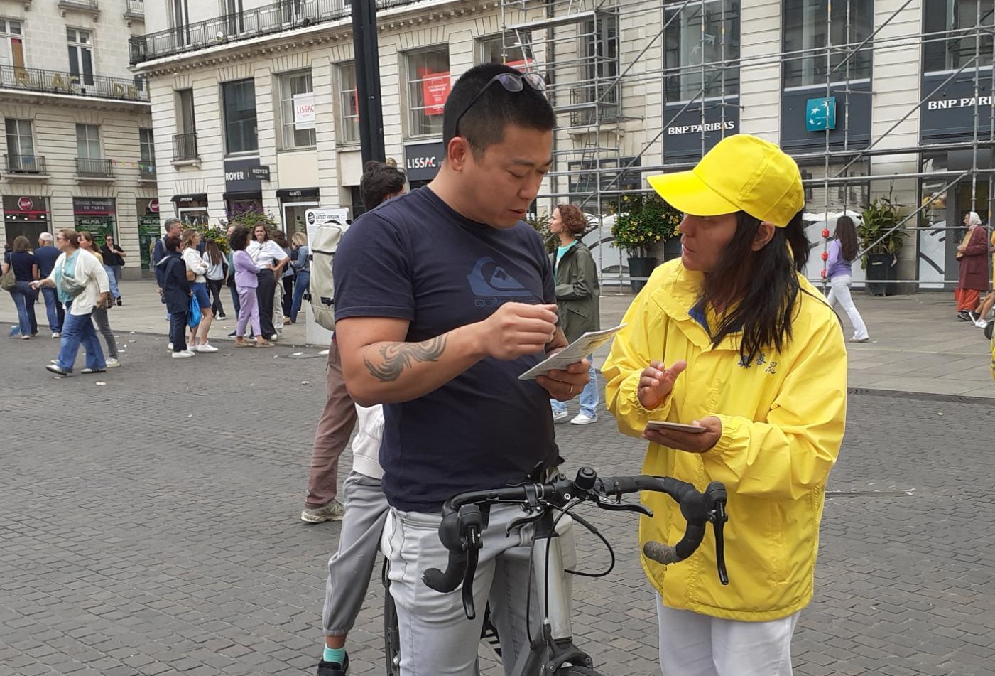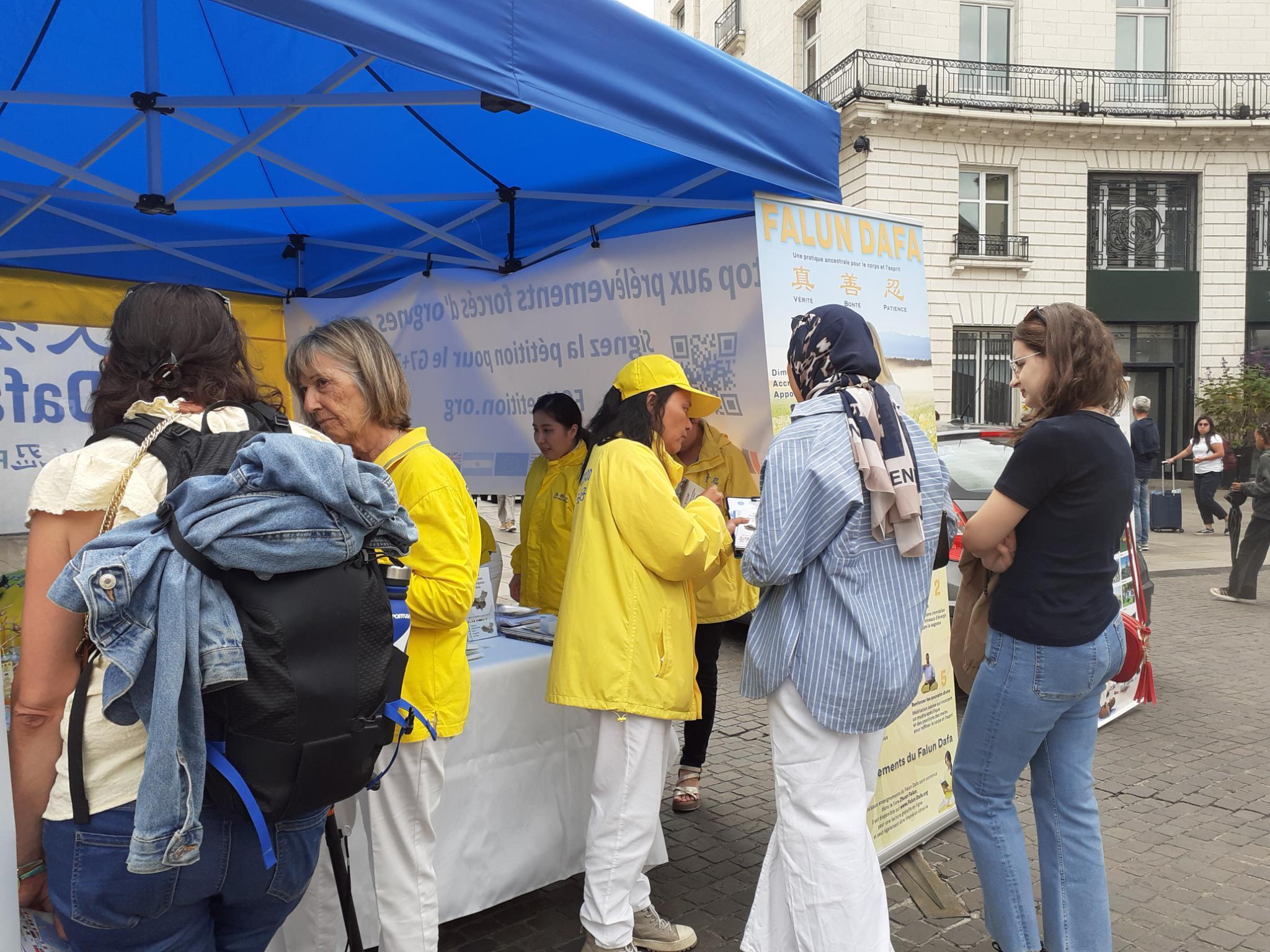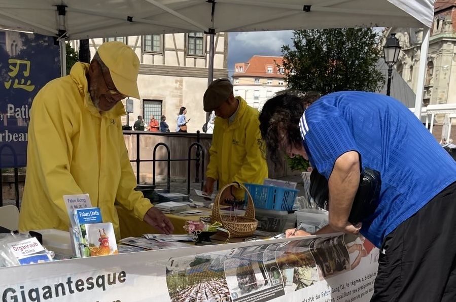 一位女士起初不想签名,她表示在法国也有很多问题,中国又太遥远,这与她无关。法轮功学员向她解释了中国的情况,指出这是一种反人类罪。学员说道:“我们不是中国人,但我们修炼这个功法,知道法轮大法非常好,真善忍对每个人都有益。然而在中国,中共却做着完全相反的事情,法轮大法的法轮功学员遭受迫害、酷刑,甚至被杀害以摘取器官,这就是为什么我们不能保持沉默。”在详细解释后,这位女士签署了请愿书,并对法轮功学员说:“你们做得很好,所做的事情非常美好,谢谢你们!”