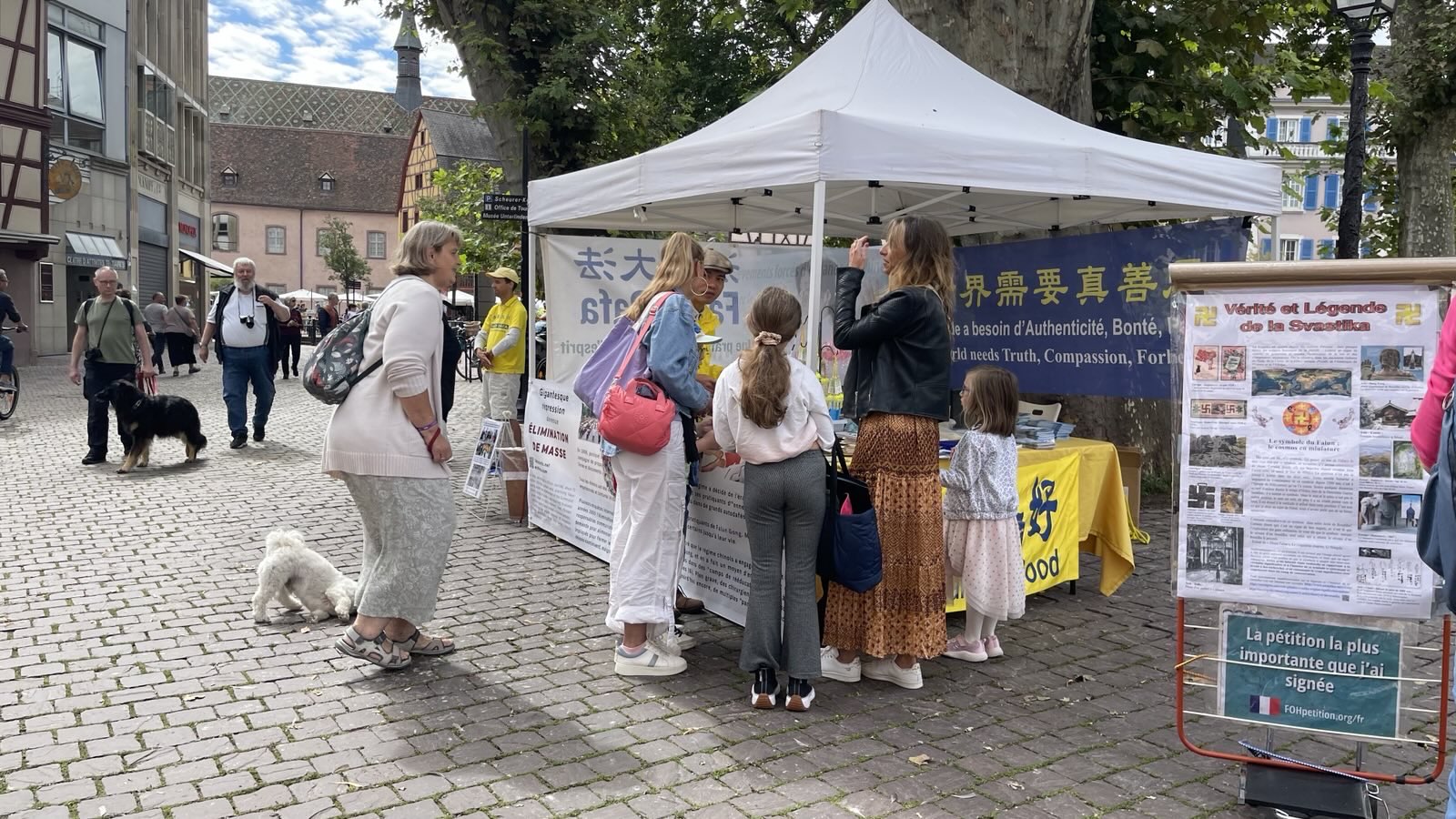 同日,在法国东部阿尔萨斯地区科尔马(Colmar)的拉辛河岸(Quai de la Sinn),法轮功学员进行了法轮功功法演示、讲真相和征签的活动。