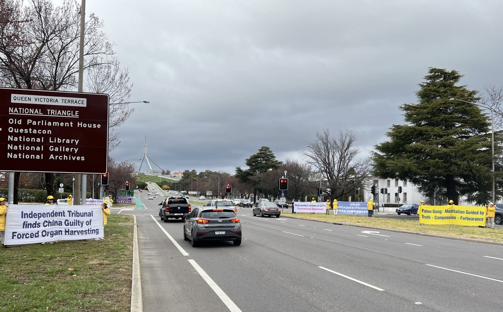 九月二日清晨,来自澳洲各地的部分法轮功学员在通往首都国会山议会大厦的主干道旁边,展示真相横幅,揭露中共的跨国镇压。其中的两面横幅写道:“在中国遭受迫害,在澳洲遭受镇压,站起来反抗中共迫害”(Persecuted in China Repressed in Australia Stand up against CCP oppression),“请伸出援手保护中共跨国镇压的受害者”(Help protect victims CCP’s Transnational Reperession)。