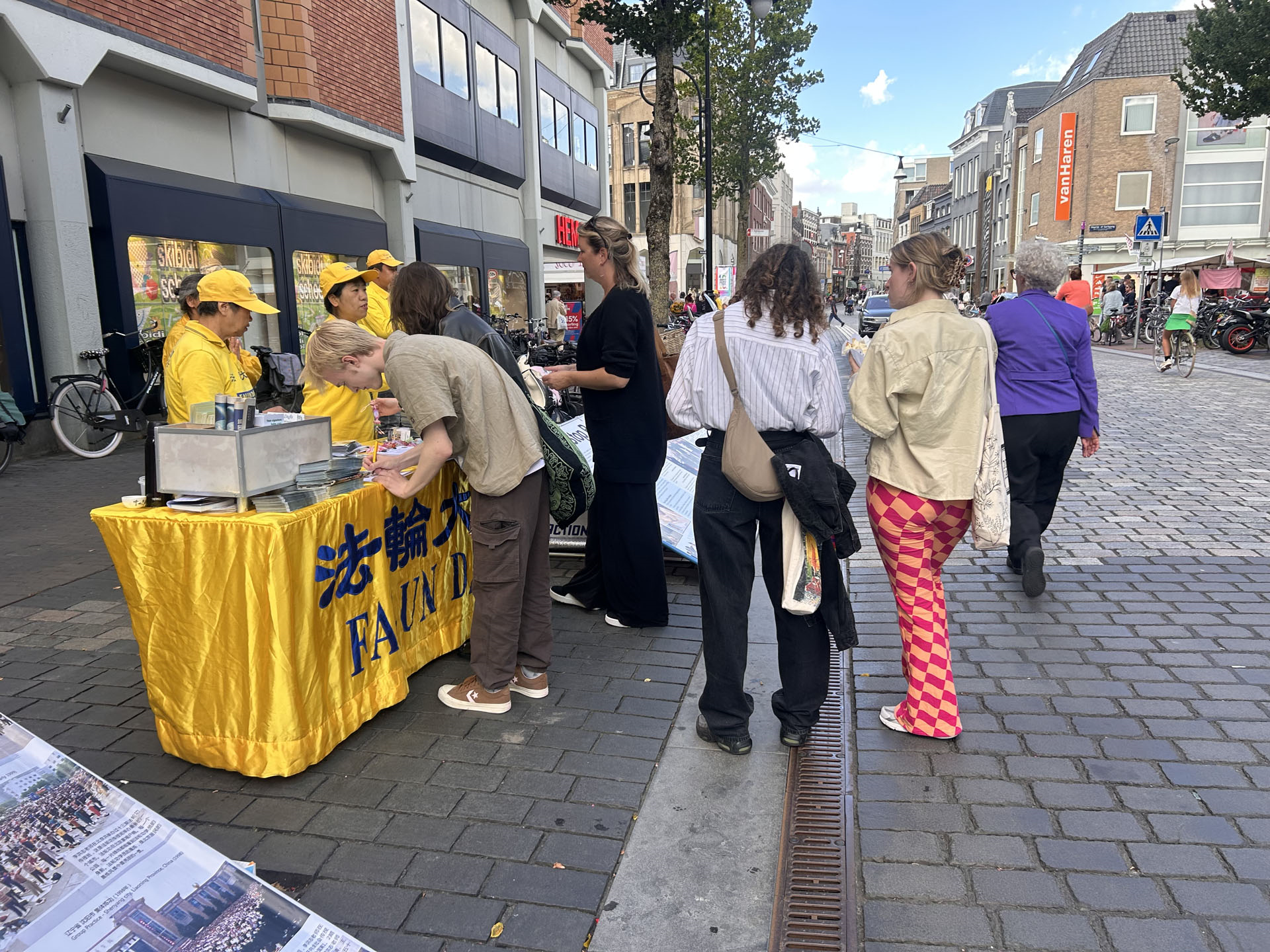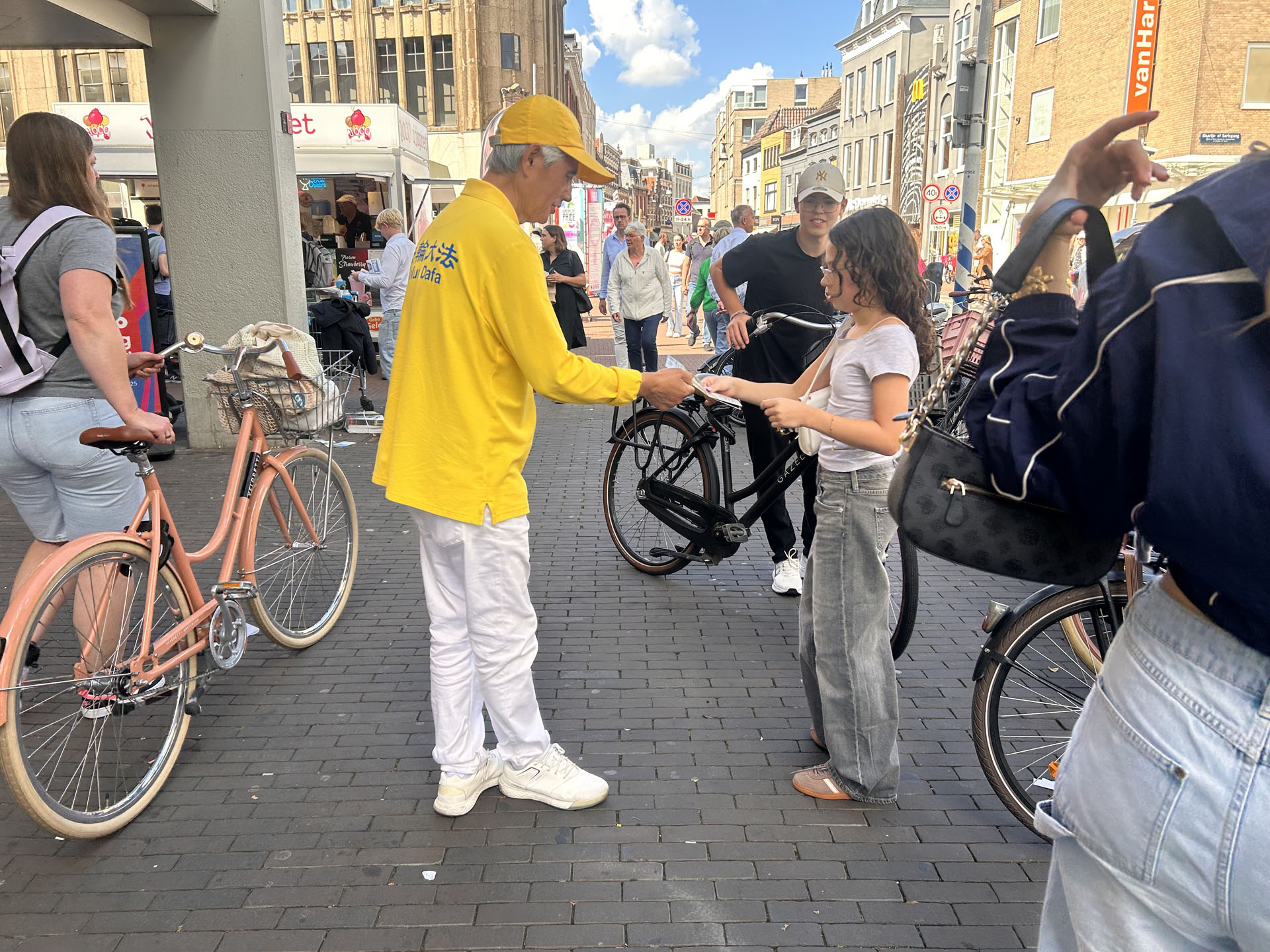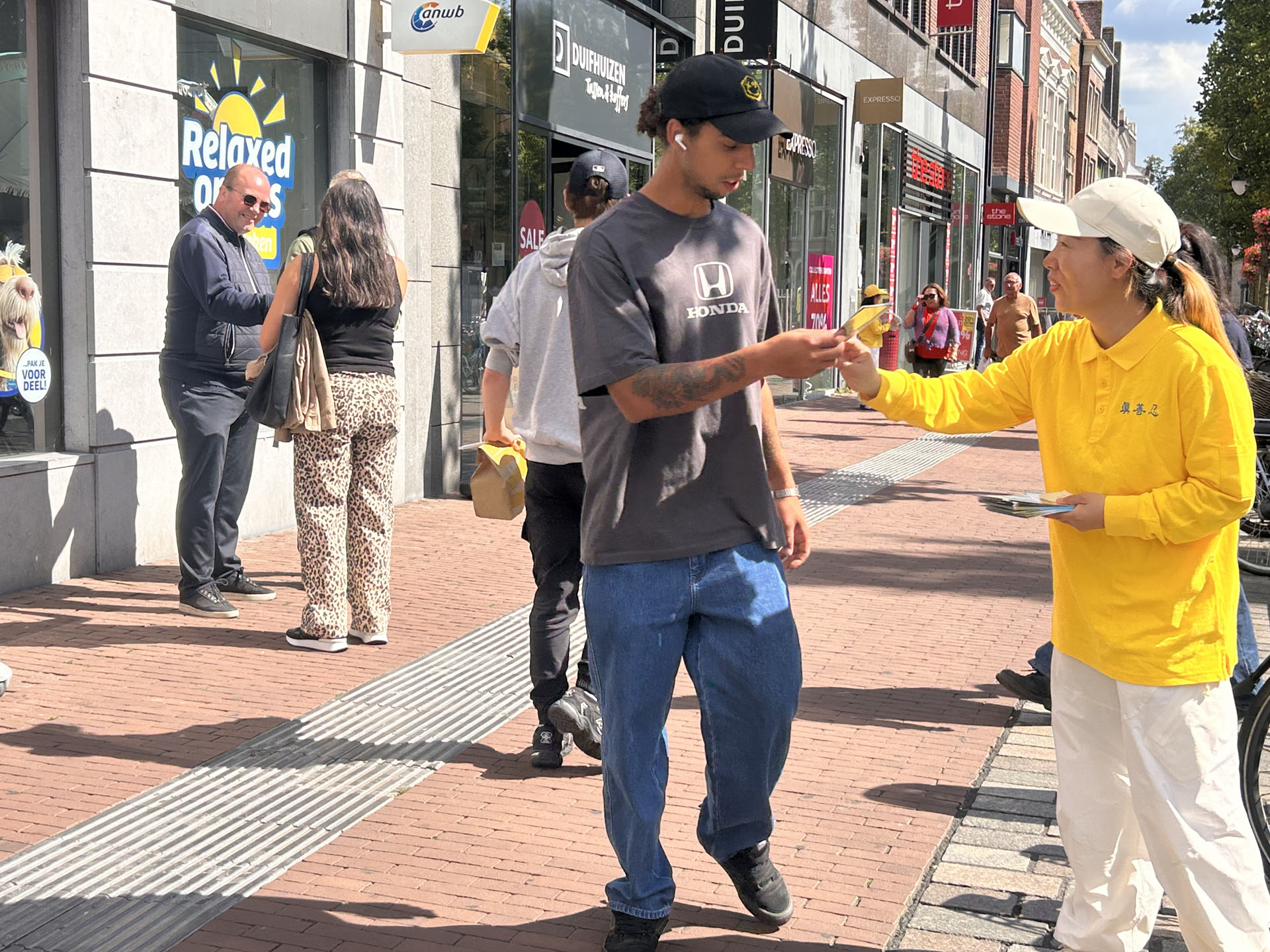 星期六午后,学员们在多德雷赫特市商业中心布置真相展板,展示法轮功功法,发放传单,征集反迫害签名,吸引络绎不绝的行人驻足了解。善良的多德雷赫特居民听闻法轮功修炼者在中共统治下的中国无法自由修炼,至今仍在遭受残酷迫害时,纷纷在向G7+7国家提交的请愿书上签名表达支持,甚至在征签桌前排起了队(注:G7国家为美国、加拿大、法国、德国、意大利、日本、英国,+7国家为阿根廷、澳大利亚、印度、以色列、墨西哥、韩国及台湾)。