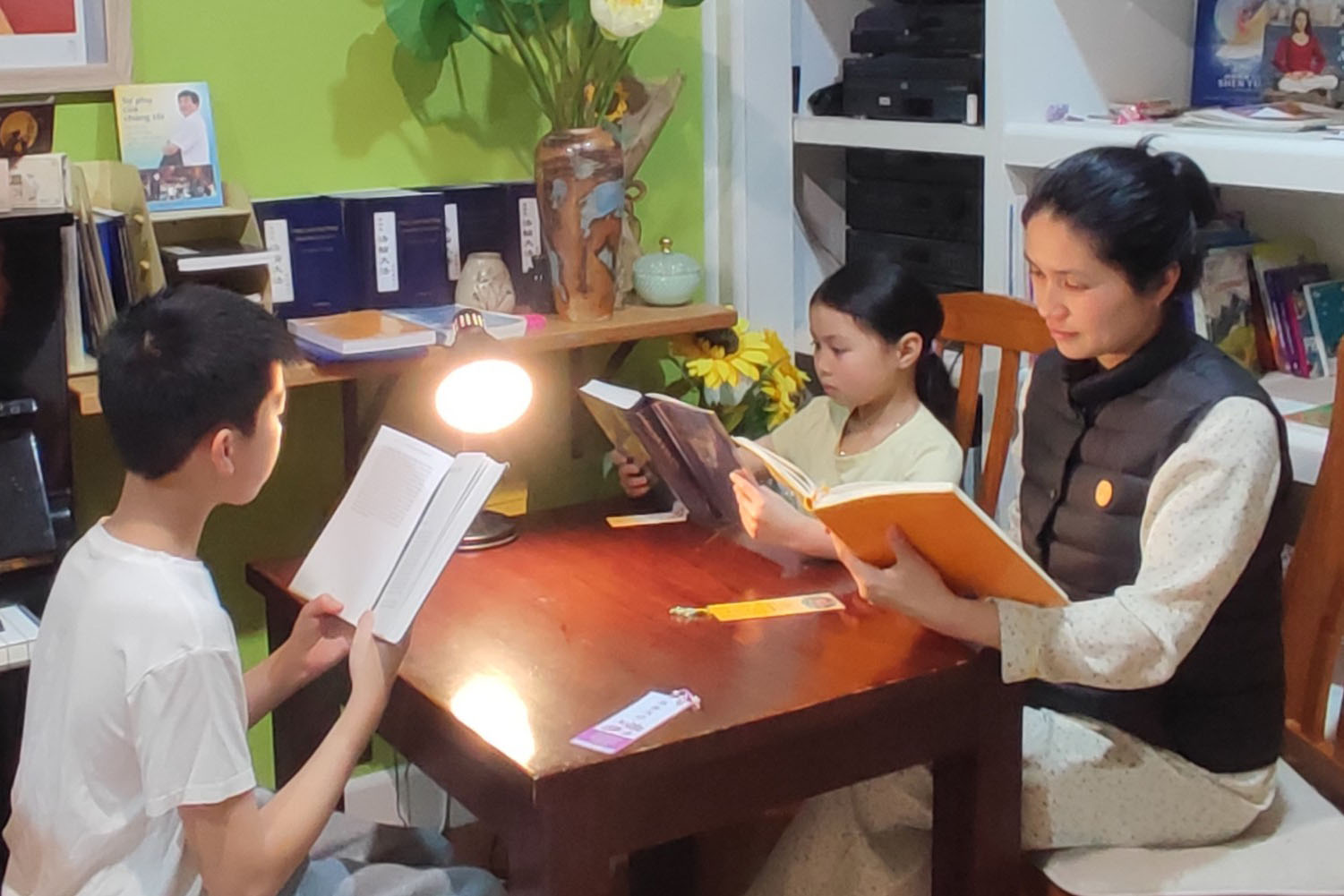 ![]() 图15:墨尔本法轮功学员阮氏芳清和一双儿女一起阅读《转法轮》。 |