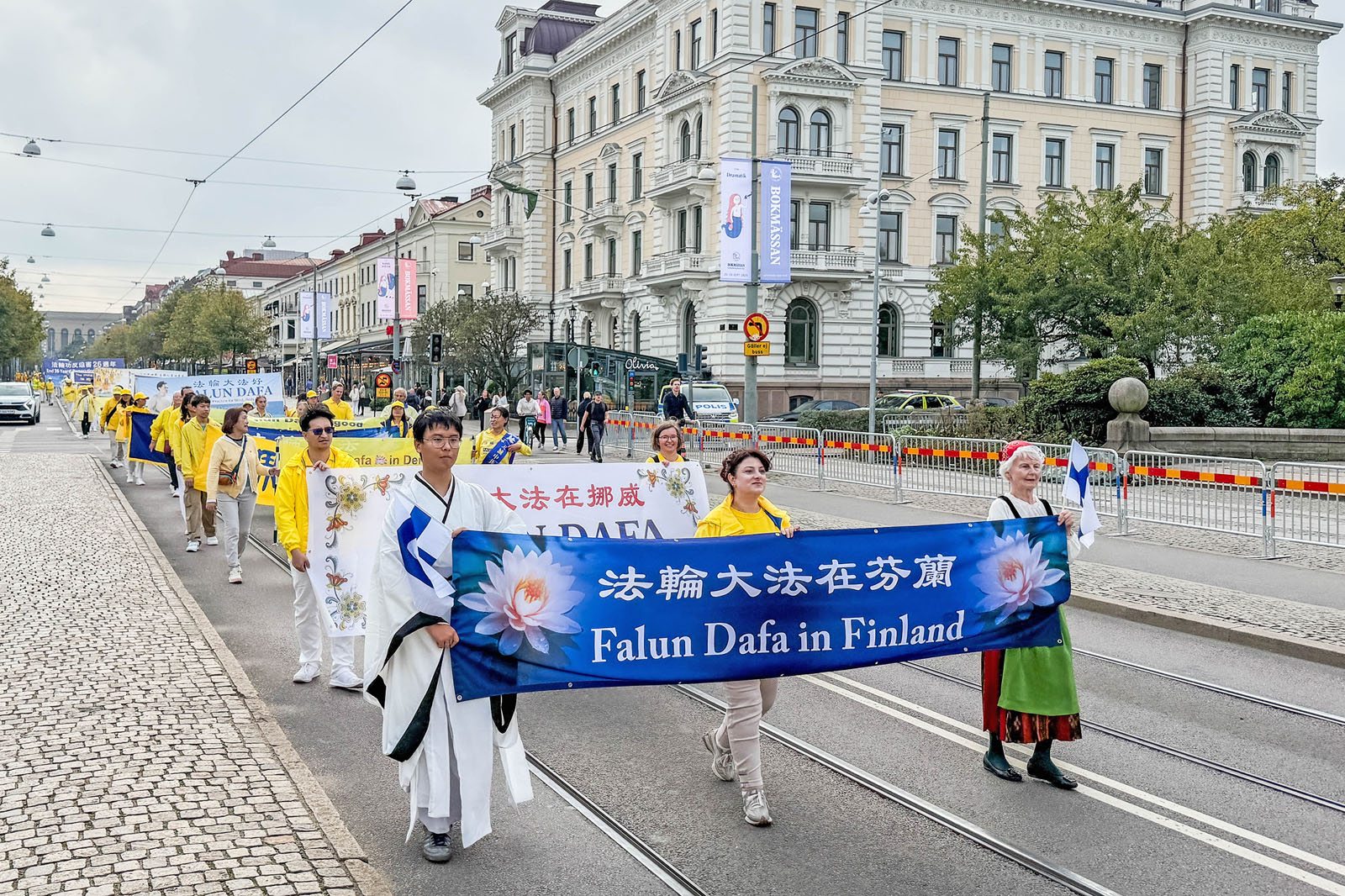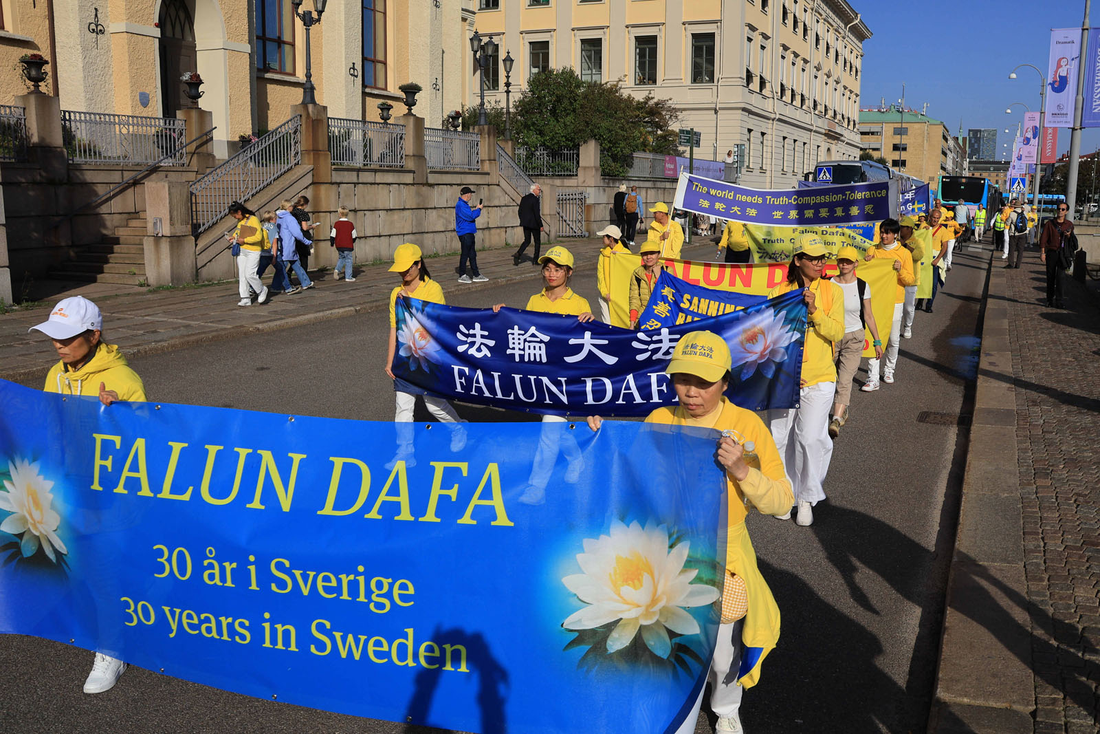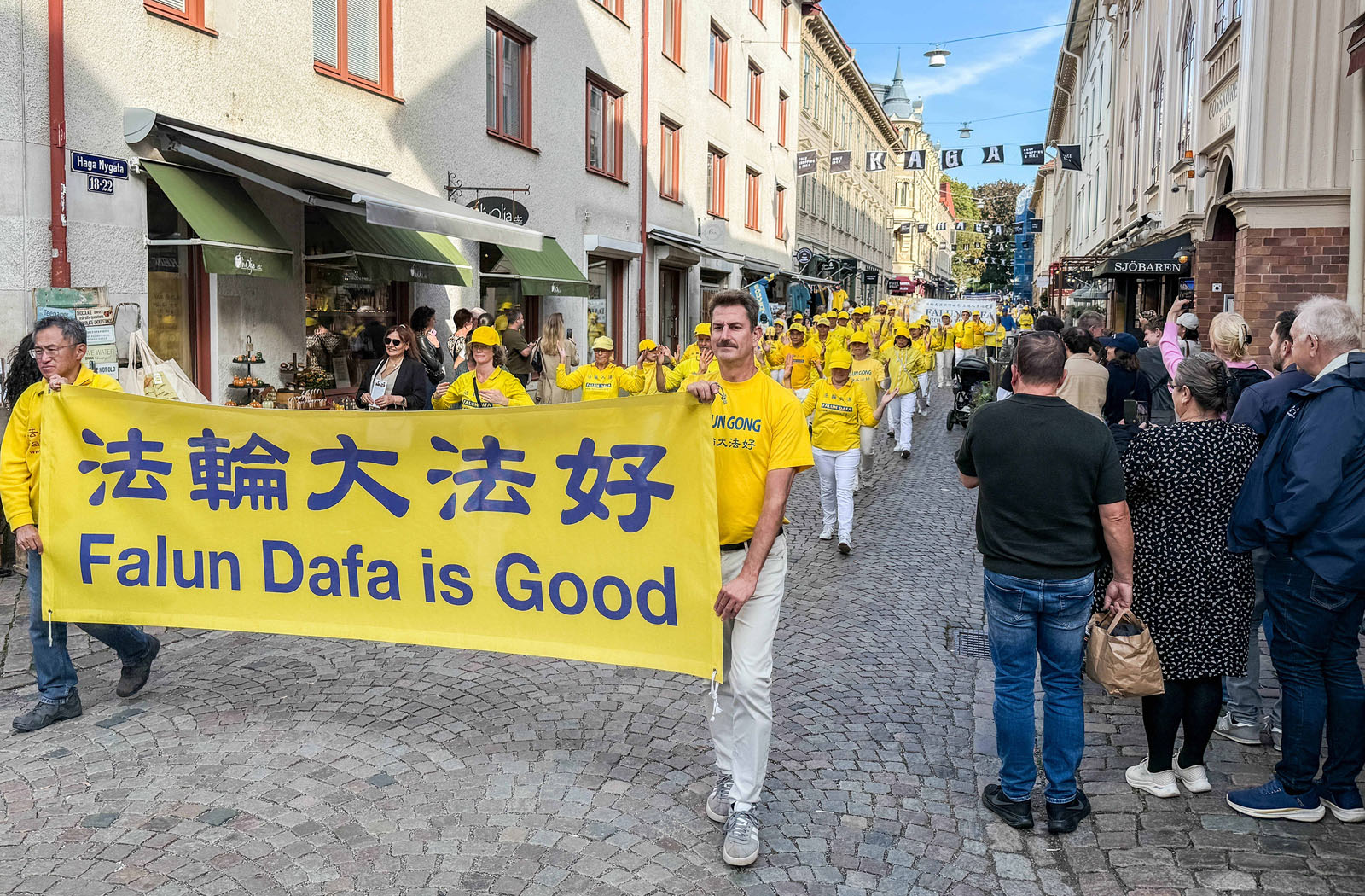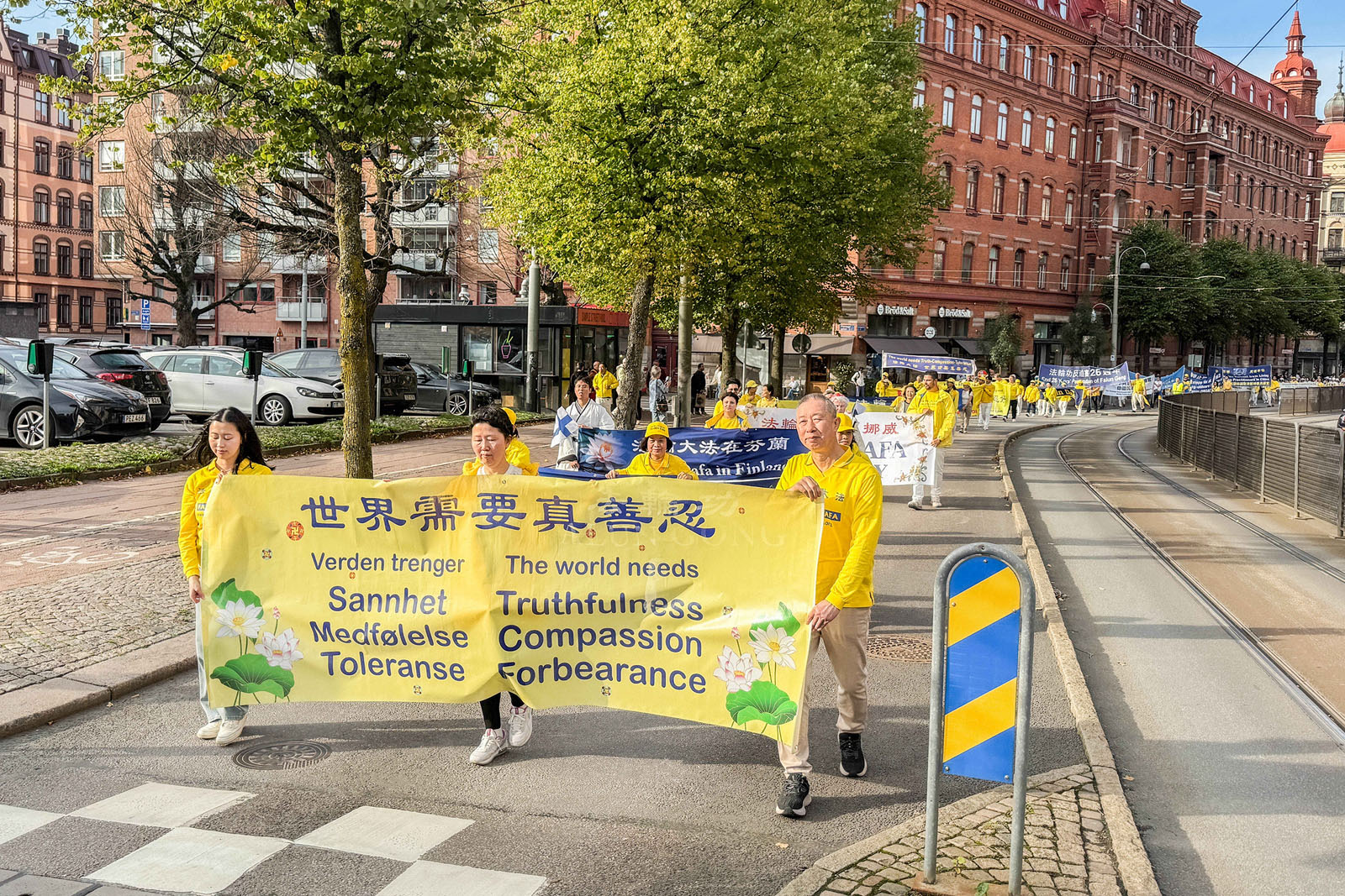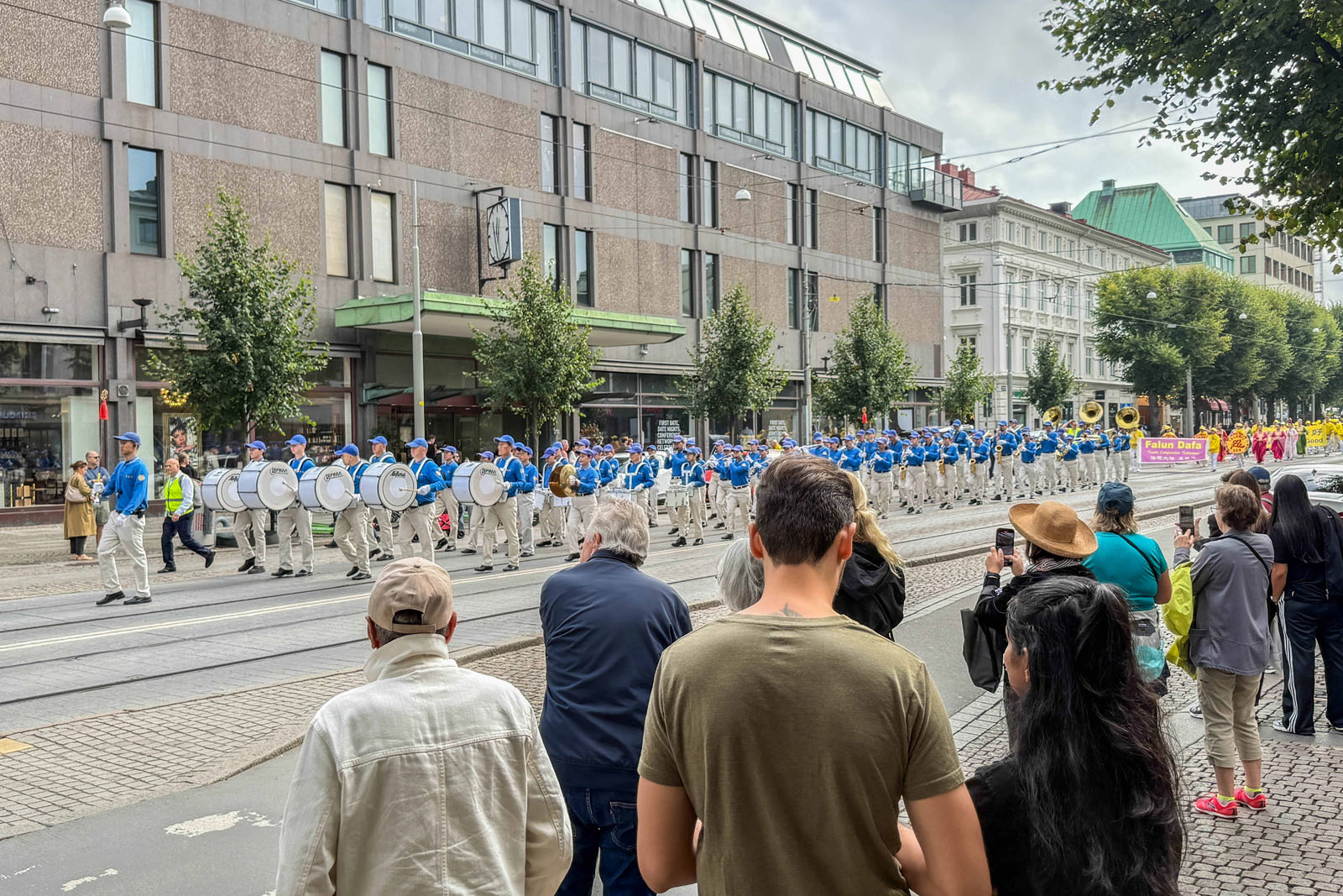 在著名的国王门大道(Kungsportsavenyen)上,众多路人停下脚步,看着眼前这支独特的队伍,感受着各族裔法轮功学员带来的祥和,很多人拿出手机拍摄留念。首先映入眼帘的是天蓝色的天国乐团,乐曲雄壮威武、气势恢宏;随后是醒目的三个大字——真善忍;紧接着的金色方阵里,法轮功学员们演示着舒缓的功法动作,看着各色横幅,人们了解到法轮大法不仅在北欧,还弘传世界逾百个国家。祥和的游行队伍、美好的信息,令市民和游客心生敬意和感佩,也被法轮功吸引希望了解更多详情。