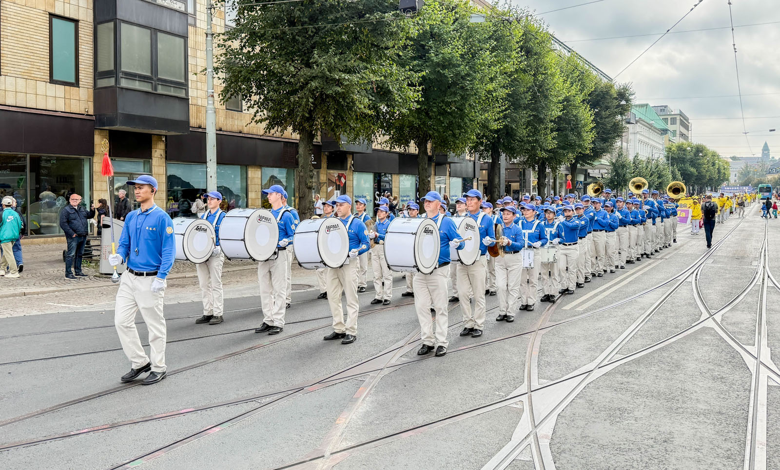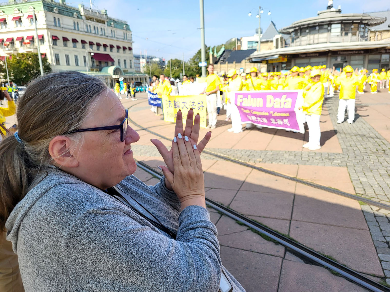 克里斯蒂娜·特兰伯格(Kristina Tranberg)推着助行车,虽然行动不便,但是她一直在附近没有离开,直到游行队伍又返回到原点。克里斯蒂娜激动地分享道:“我原本只是路过,但听到这音乐后,整个人都暖和了起来。这是我第一次听到这种旋律,感觉象是心灵被触动了。”她一边擦拭眼角的泪水,她说曾在电视上听说过这类表演,但亲眼所见到的法轮功队伍,却是完全不同的震撼:“这种场面太真实了,太感人了。我觉得这些音乐不只是表演,它们传递的是一种原理真、善、忍。”