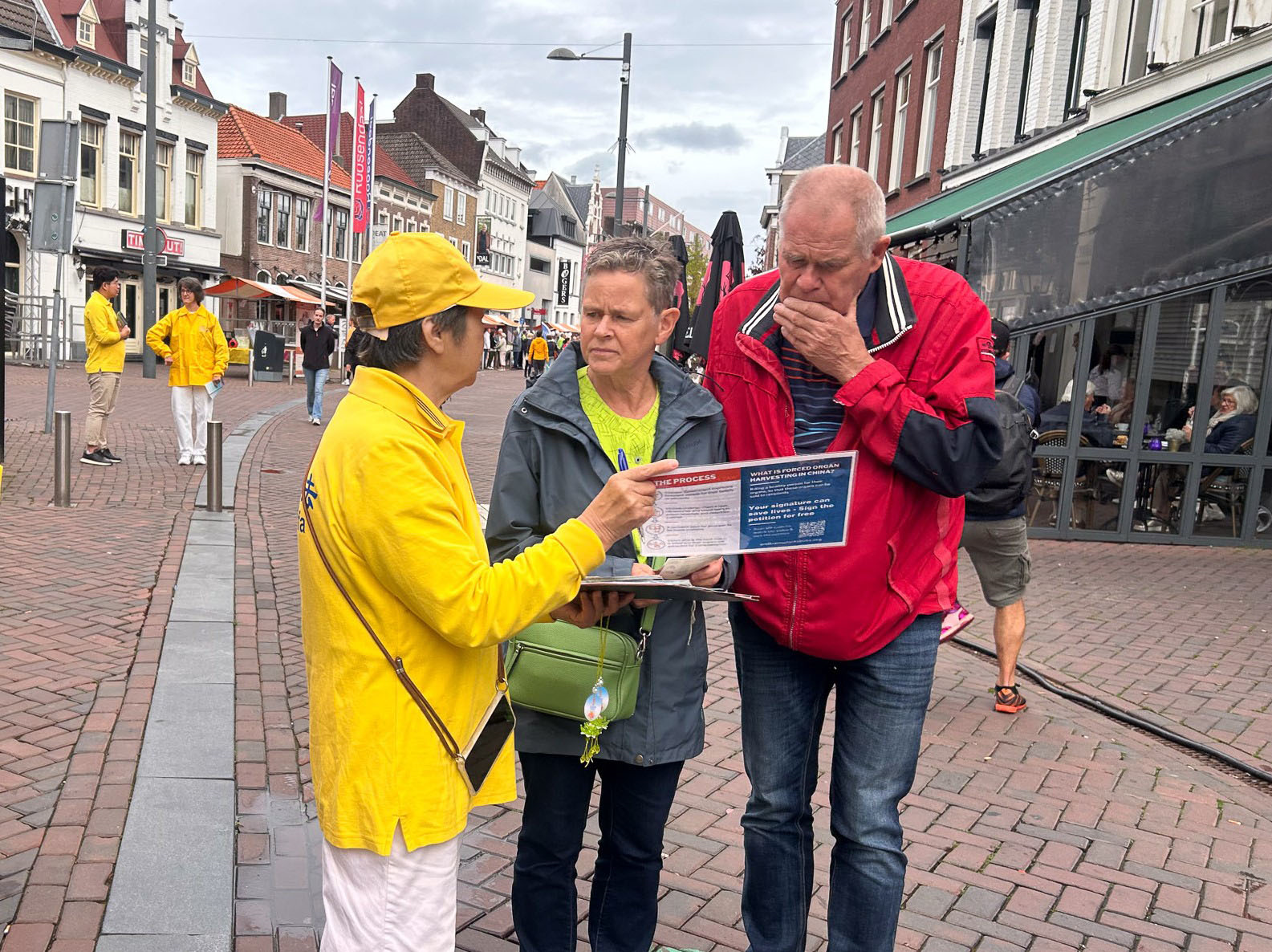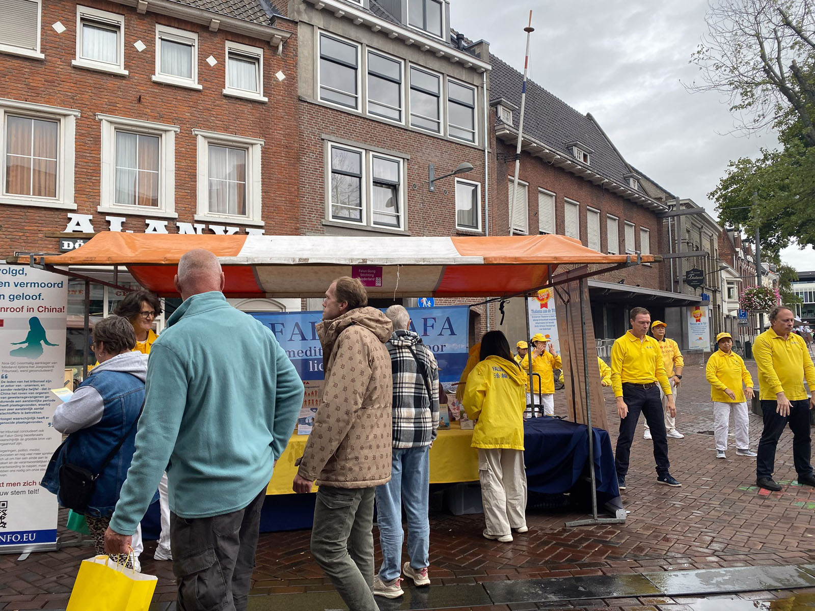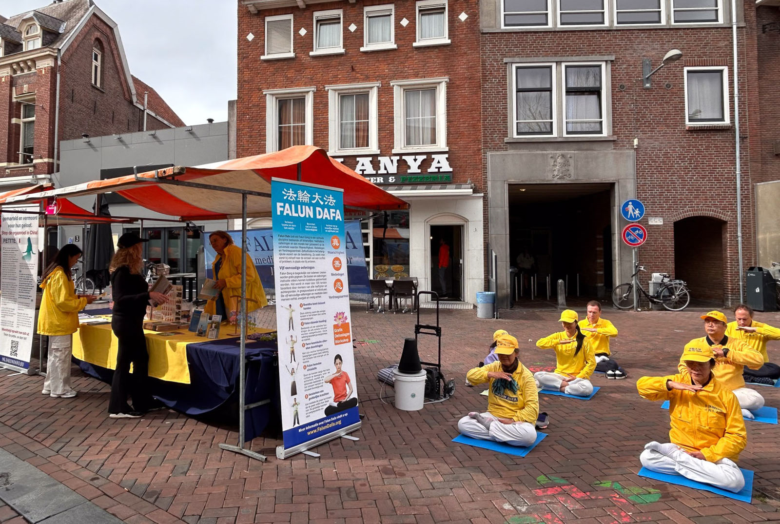 星期日中午,法轮功学员在罗森达尔市花卉市场(Bloemenmarkt)设置展位,向游客介绍法轮功的功法动作,发放传单,并揭露中共法轮功真相,征集支持反迫害的签名。许多民众被吸引,有人静静地观赏;有人跟着学习炼功动作;也有人在了解真相后签名支持法轮功学员反迫害。