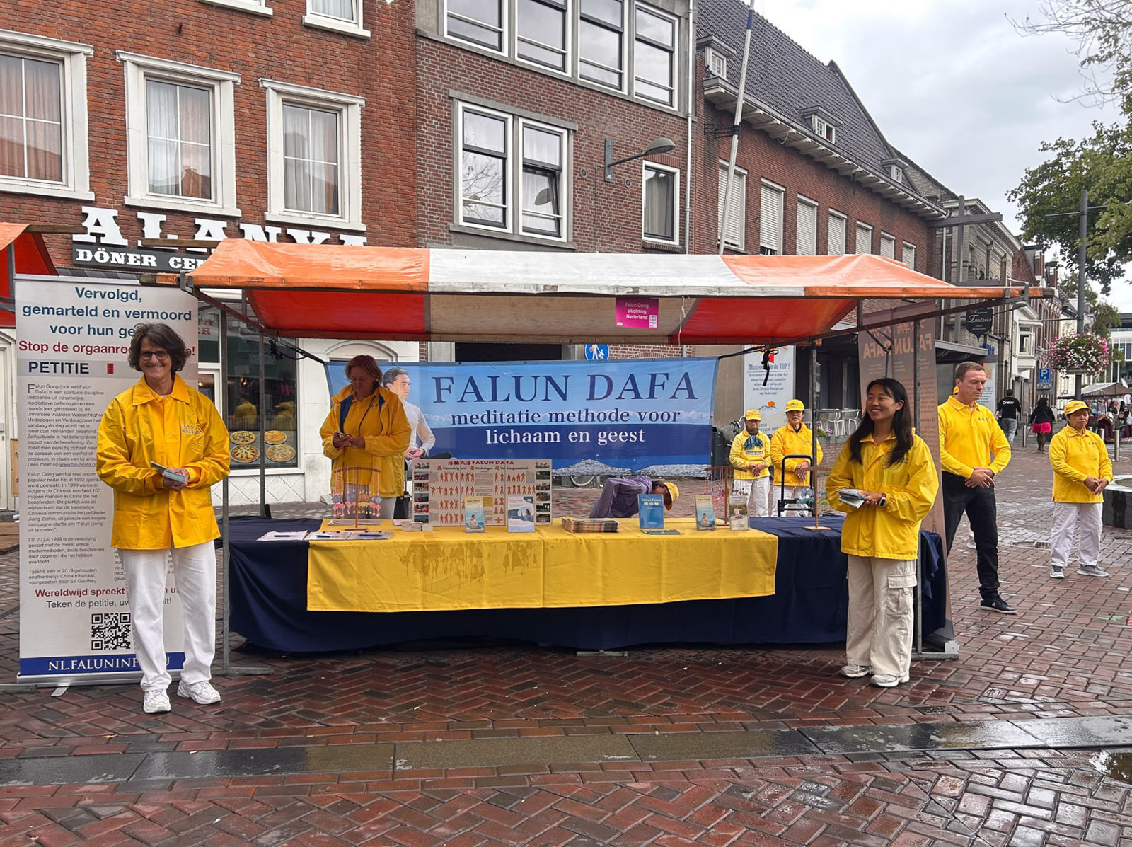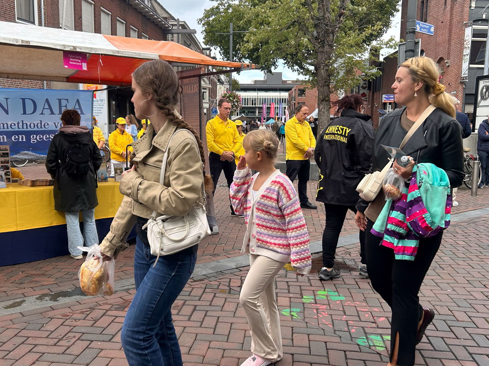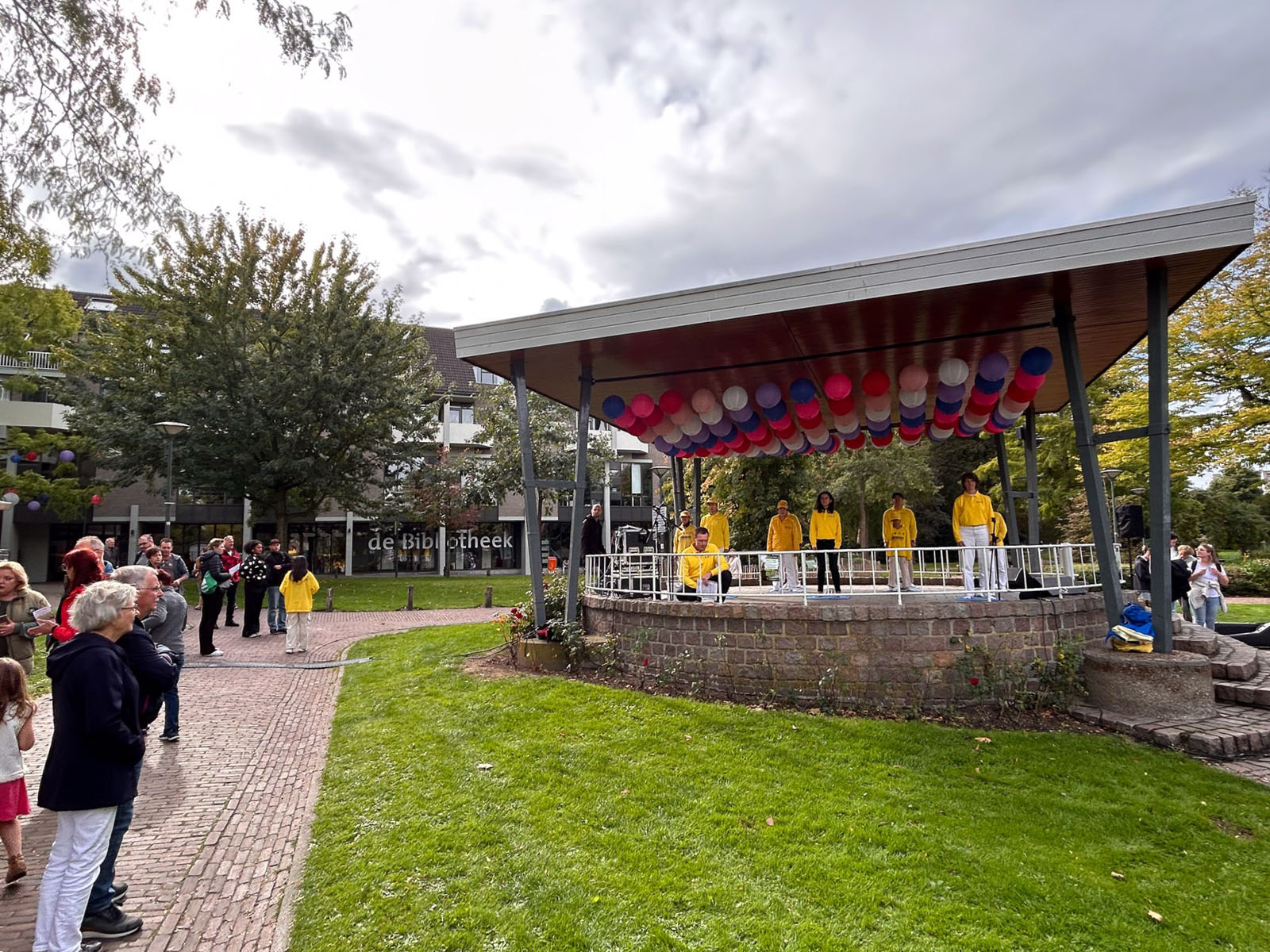 星期日中午,法轮功学员在罗森达尔市花卉市场(Bloemenmarkt)设置展位,向游客介绍法轮功的功法动作,发放传单,并揭露中共法轮功真相,征集支持反迫害的签名。许多民众被吸引,有人静静地观赏;有人跟着学习炼功动作;也有人在了解真相后签名支持法轮功学员反迫害。