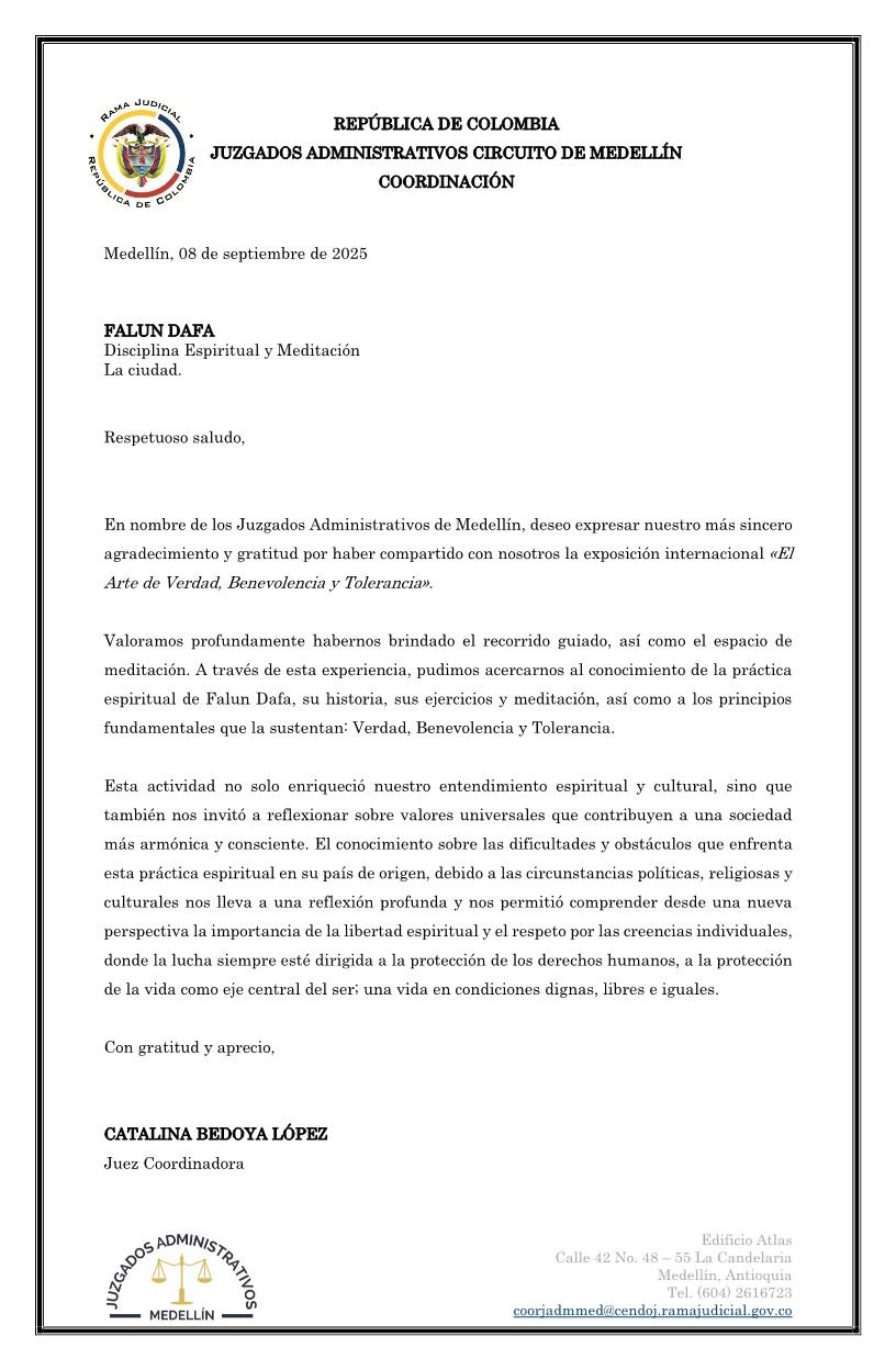 以下是麦德林市行政法庭协调法官卡塔利娜·贝多亚·洛佩斯的感谢信全文: