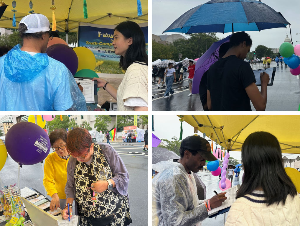 有的参观者表示,法轮功学员的展位与所有展位都不一样,带给人宁静舒适的感受;有的参观者感谢法轮功学员在这混乱的世界中,将真、善、忍这重要的信息带给人们; 有一位中国大陆游客连续两天来到法轮功学员的展位前了解真相,并表示回国后把真相告诉国内的亲朋好友。有一位华盛顿老年中心的负责人邀请法轮功学员下星期到中心教功,他说希望那里的近四百位老人也能身心受益。