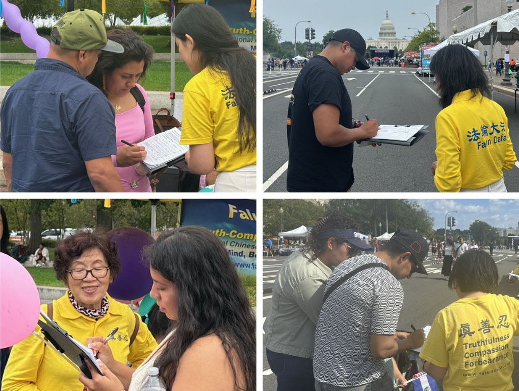 ![]() 图1~2:二零二五年九月二十七日和二十八日两天,在美国首都华盛顿的宾夕法尼亚大道上,举行了为期两天的拉丁文化嘉年华(Fiesta DC),法轮功学员在展位前向游客讲真相。 |