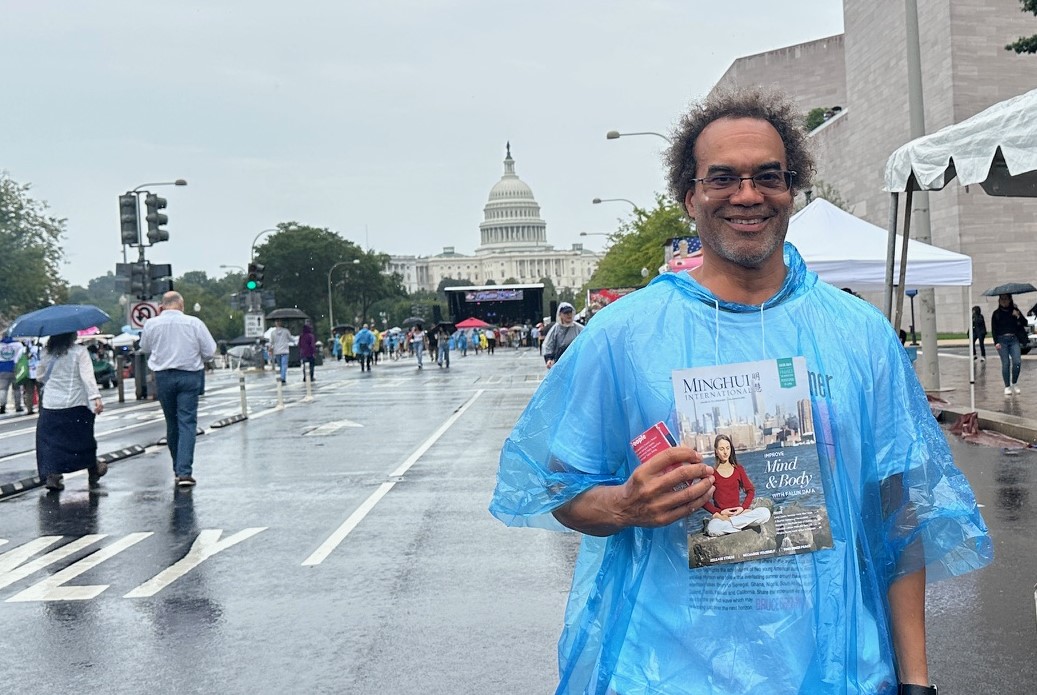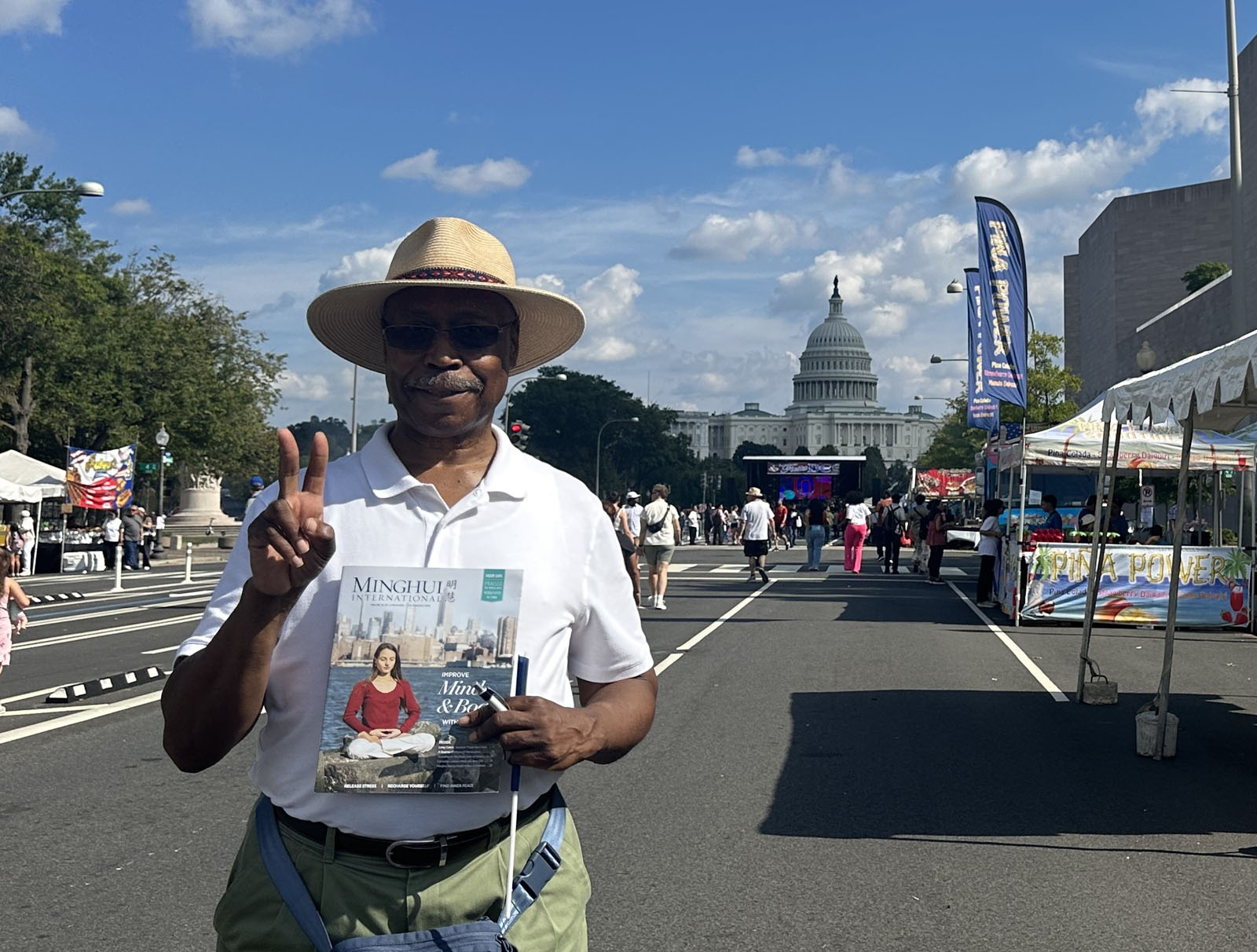 九月二十七日活动的第一天,很多人冒雨来参加庆祝活动。居住在华盛顿的迈克尔(Michael)曾在当地做了三十多年的律师。他被展位前的功法演示吸引过来。“这个功法看起来很平和。” 他表示大约一两年前,在一个购物中心附近散步时,收到一本法轮功真相小册子。迈克尔说:“真、善、忍听起来很好,我阅读了那本小册子。”
