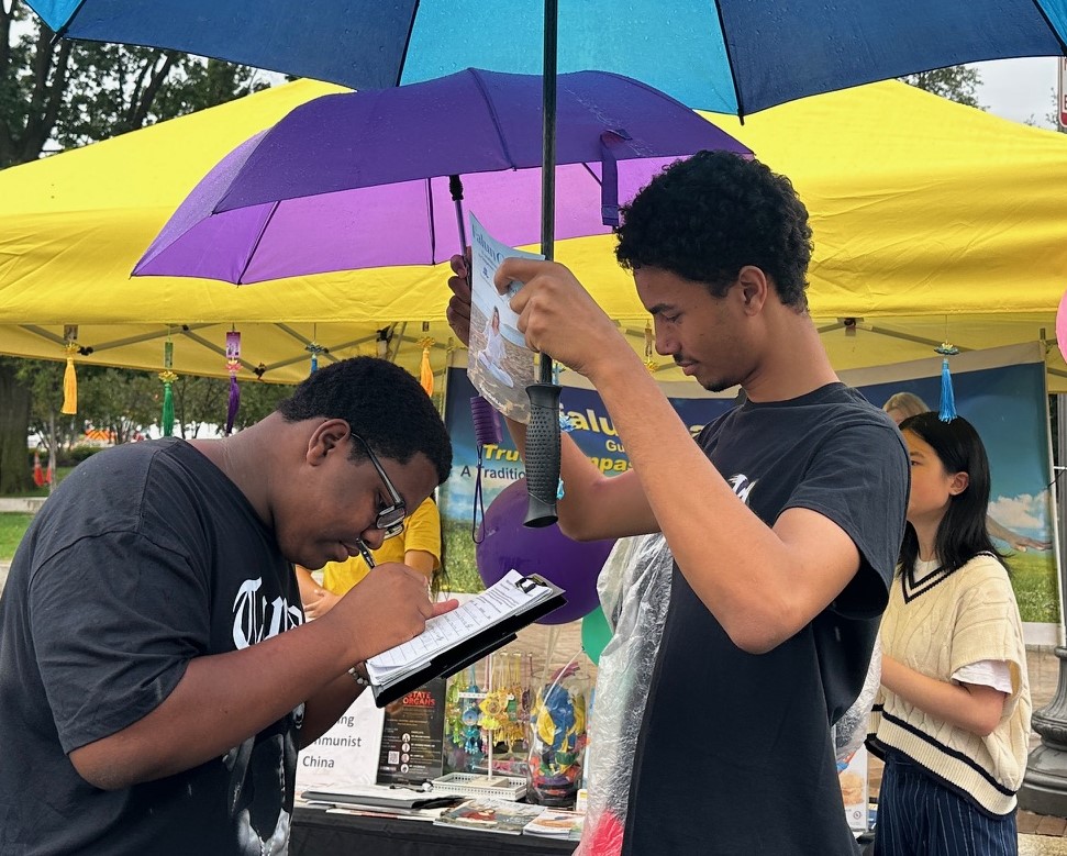 ![]() 图7:九月二十七日,克里斯蒂安(左)和苏莱曼(右)冒雨参加活动,他们了解真相后,在呼吁制止中共迫害的请愿书上签名。 |