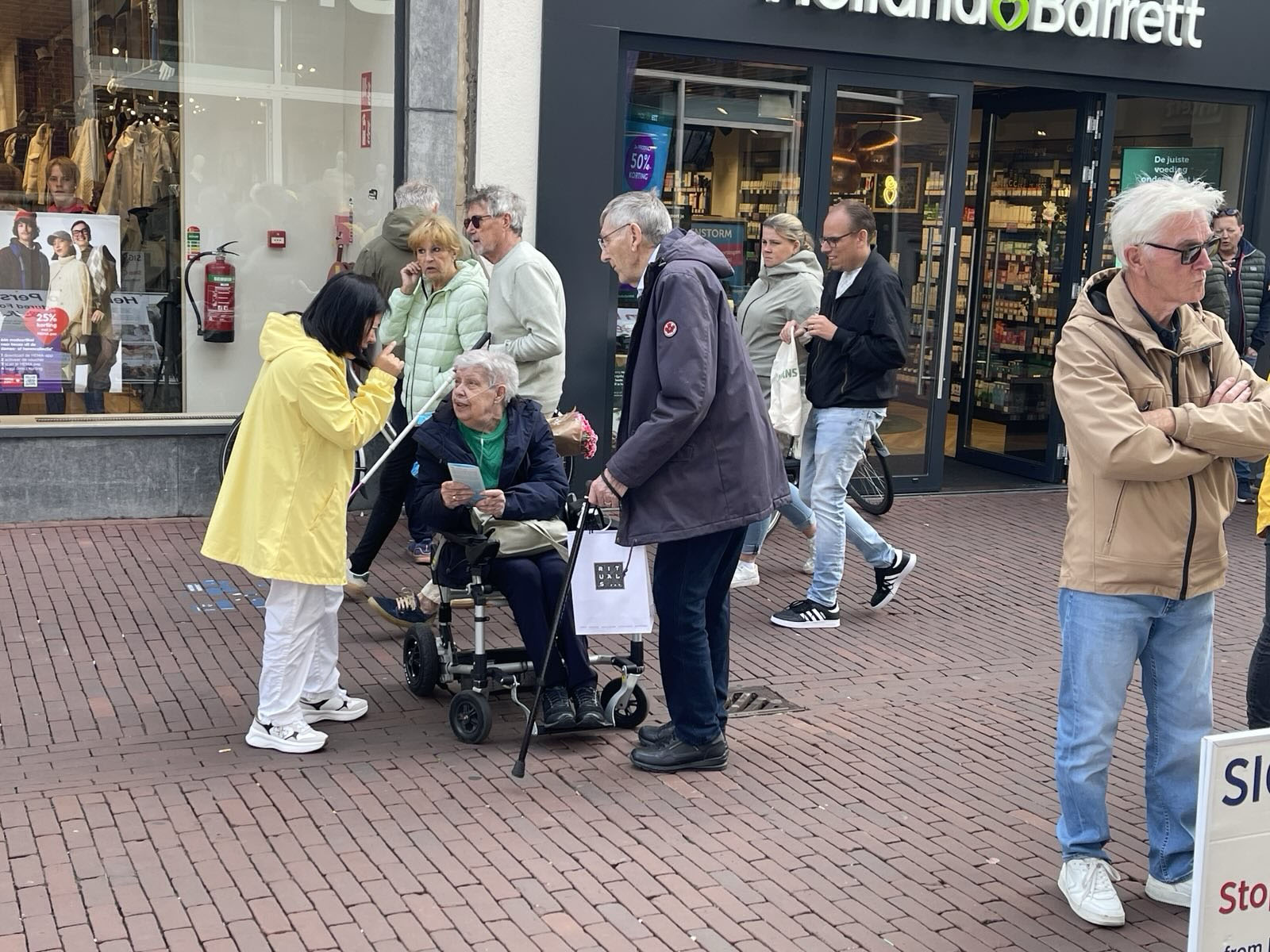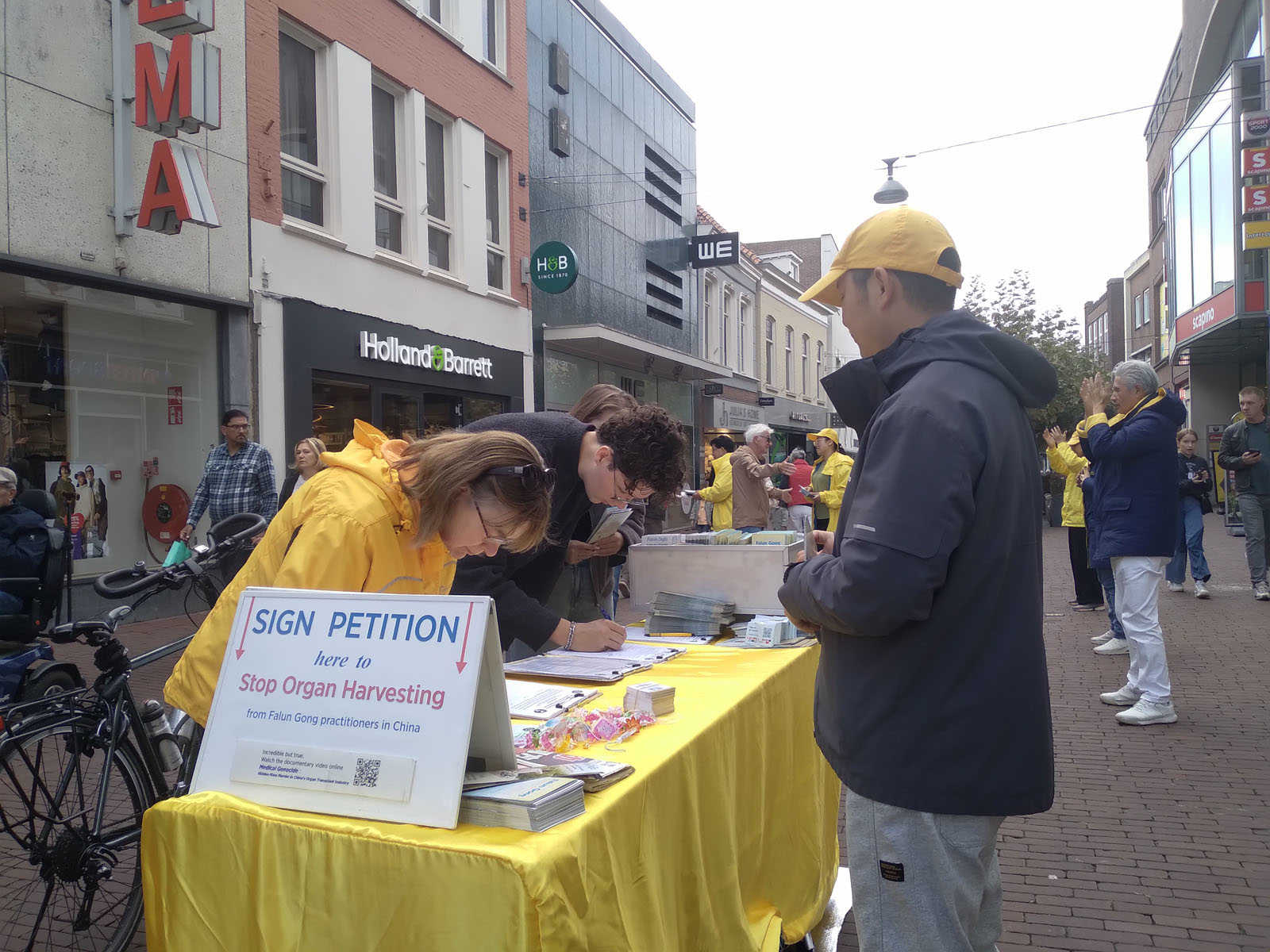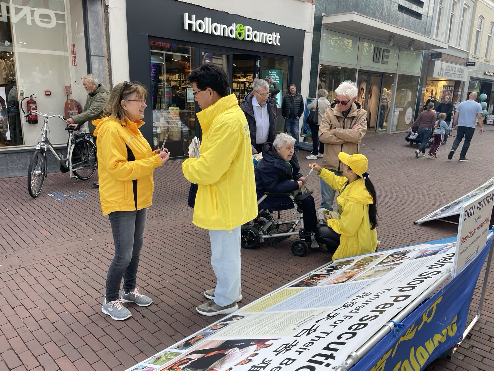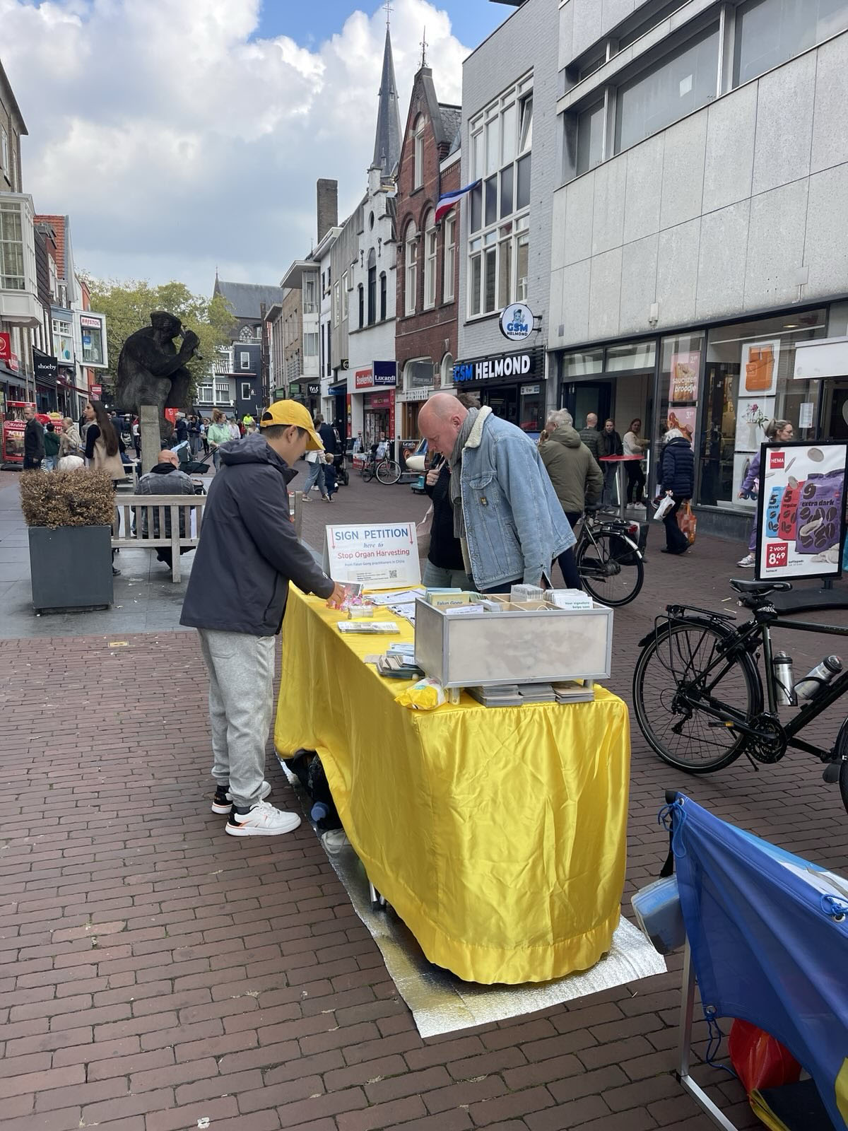 赫尔蒙德是荷兰北布拉班特省(Noord Braband)的一个城市。中午时分,学员们在赫尔蒙德市场街(Markt)布置真相展板,展示法轮功五套功法,与民众交谈,向民众征集反对迫害的签名。