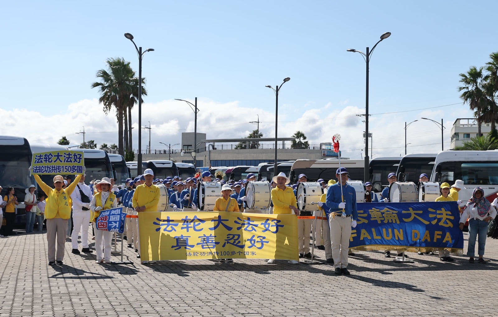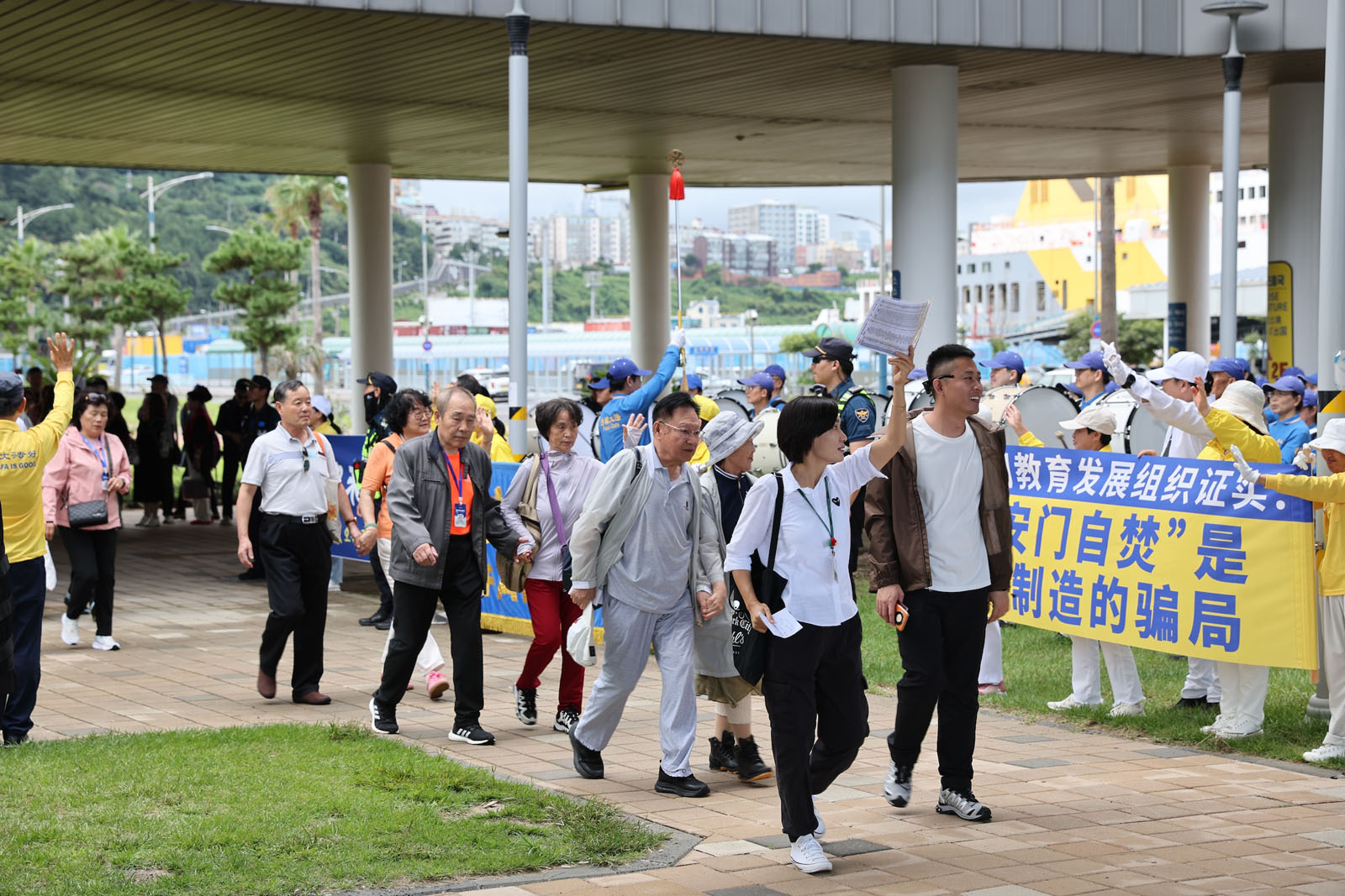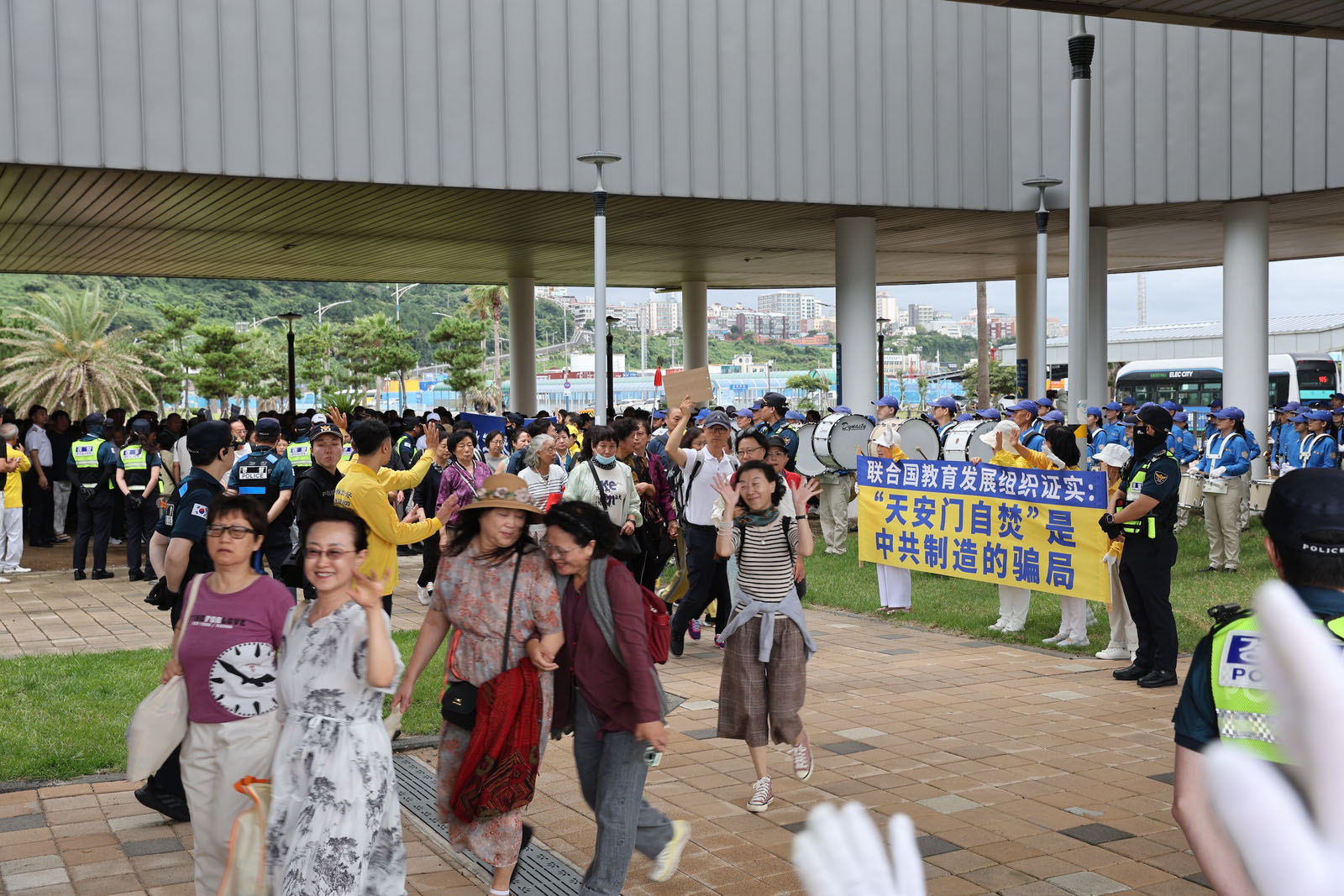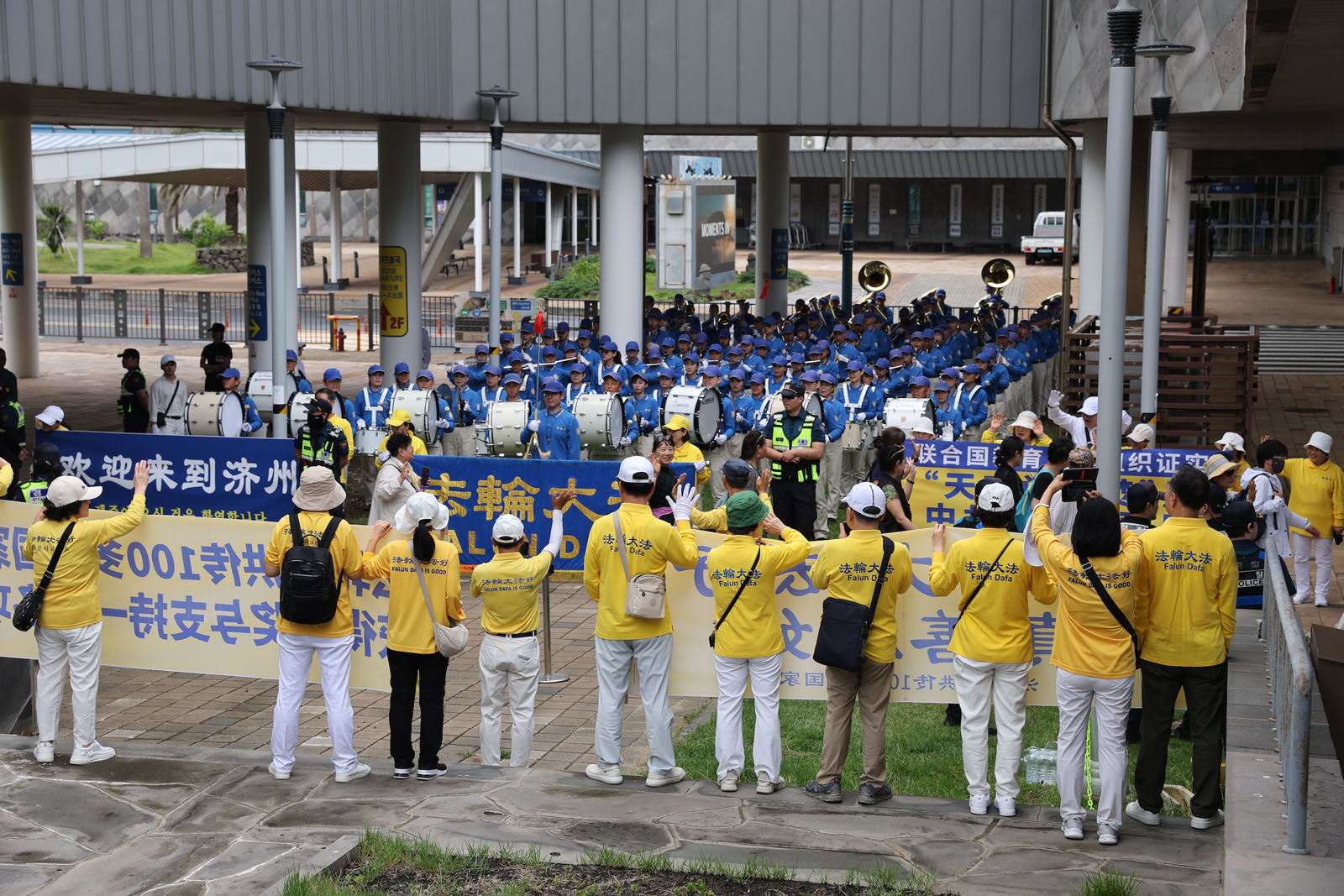 法轮功学员早早来到济州港码头,最前方挂上了“欢迎来到济州”的横幅。当第一批游客出来时,天国乐团奏响了《法轮大法好》,许多中国游客面带笑容,挥手致意。一些勇敢的中国游客忙着拍摄乐团演奏和学员们打出的横幅。