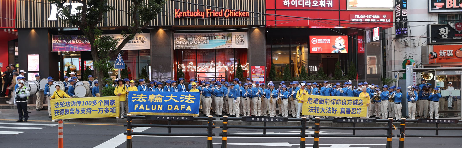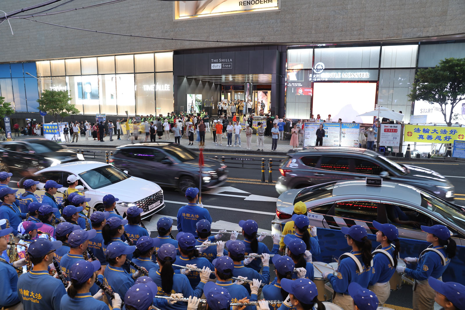 随后,天国乐团又到约五百米外的新罗免税店门口演奏。场面同样壮观,大批游客瞬间涌出正门,短短百米区域人山人海。因为进入新罗免税店必须经过正门,游客购物途中听到音乐纷纷出来,拿手机拍摄,或认真阅读展板。部份会中文的学员穿梭人群讲真相,不少中国游客当场办理“三:退.”。