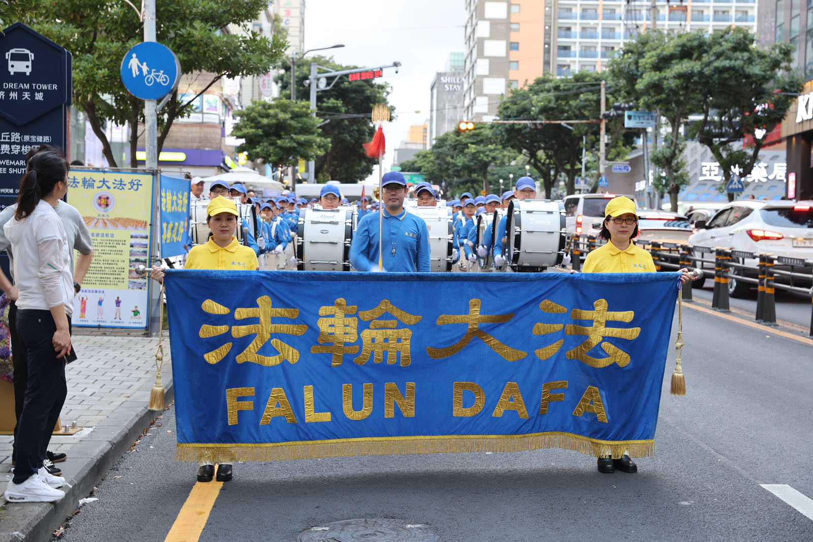江汀港讲真相活动结束后,学员们又前往中国游客必到的济州市内“新罗免税店”和“乐天免税店”。傍晚时分,天国乐团先在乐天免税店前演奏,音乐一响,店内的中国游客蜂拥而出,挤满正门口,他们听着音乐,看着真相横幅及展板,有些人震惊得目瞪口呆。