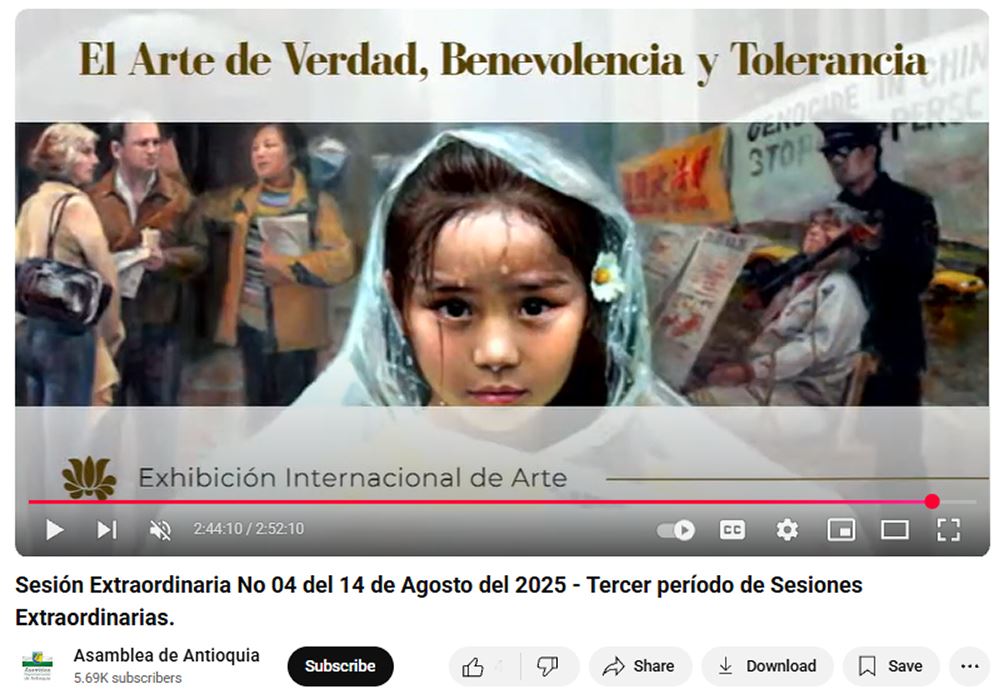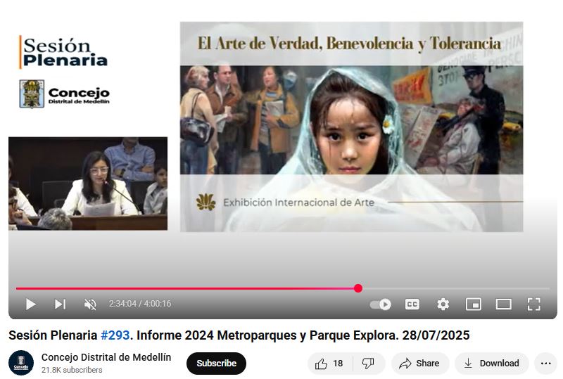 ![]() 图1:二零二五年七月二十八日至八月十五日,哥伦比亚法轮功学员在麦德林市议会举办真善忍美展,并受邀在市议会中发言。图为七月二十八日市议会官方YouTube频道直播画面截图。 |