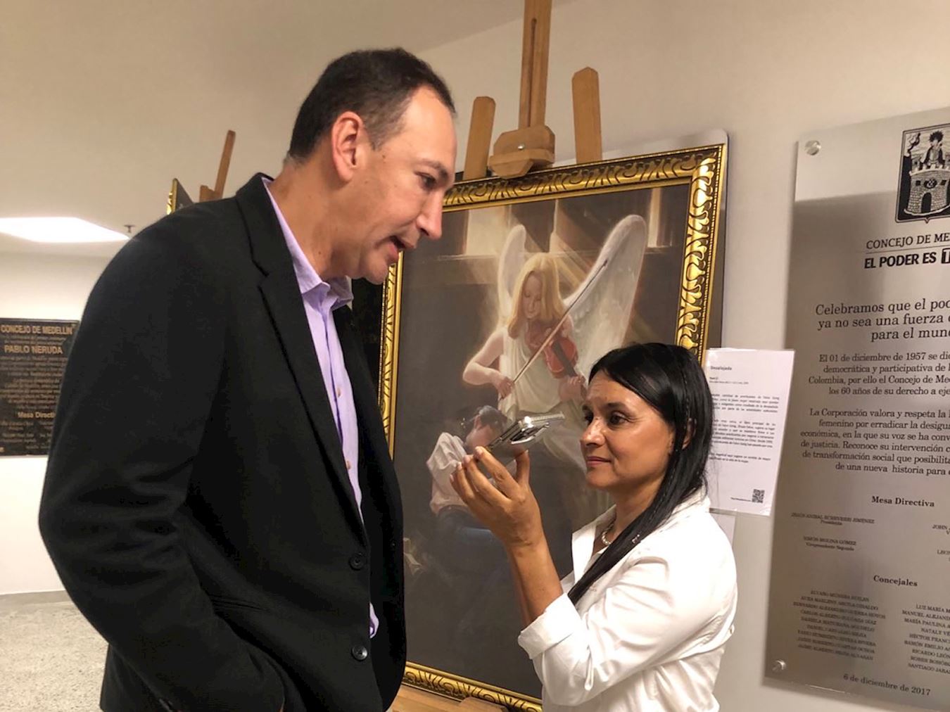 麦德林市议员胡安·卡洛斯·德拉奎斯塔(Juan Carlos de la Cuesta)祝贺法轮功学员展出这些高质量的作品。“能在市议会展示这些美丽的画作,传达关于这个社会现在和过去的信息,对我们来说是一种荣誉,”他说:“许多作品揭露了共产主义如何从人类的尊严到社会的行为及本质等方面影响着人们。”