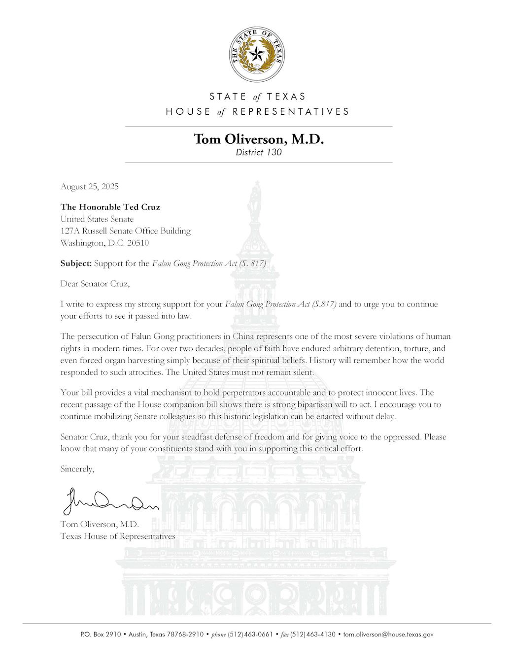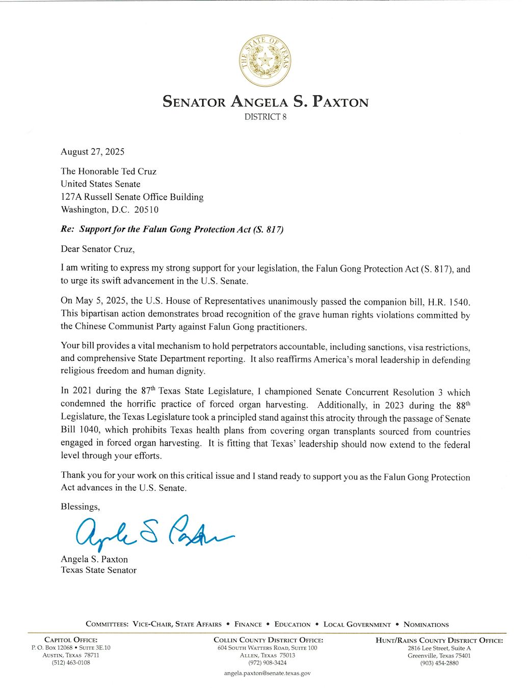德州参议员安吉拉‧帕克斯顿(Angela Paxton)、德州众议院多数党领袖汤姆‧奥利弗森(Tom Oliverson)等十位重量级议员分别致信克鲁兹参议员,强烈支持《法轮功保护法案》,感谢克鲁兹参议员在这个关键问题上所做出的努力,并敦促该法案在联邦参议院迅速推进。