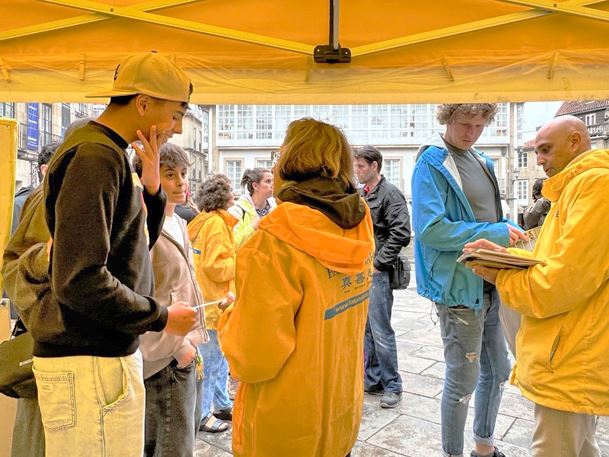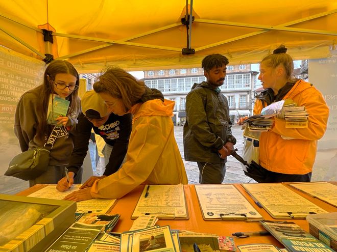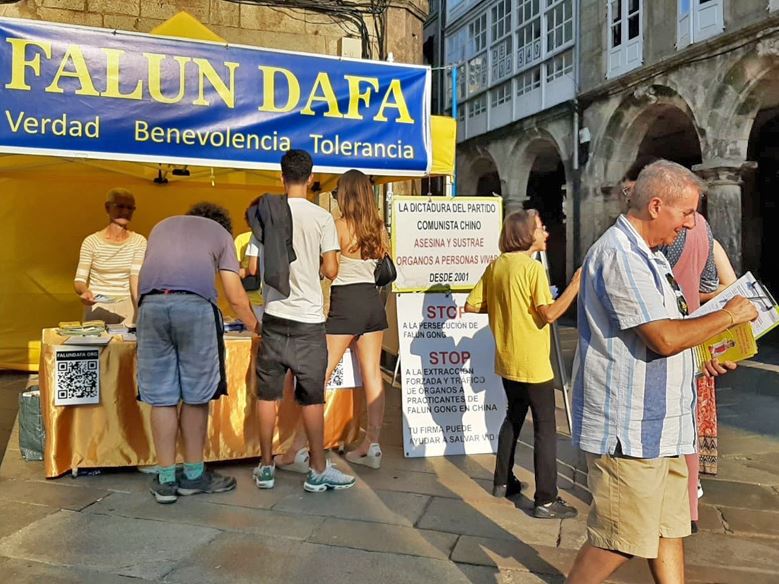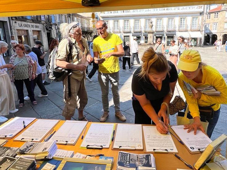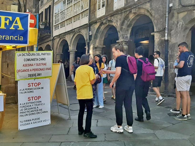 【明慧网二零二五年九月七日】二零二五年八月二十三日和二十九日,西班牙法轮功学员来到西北部城市——圣地亚哥•德•孔波斯特拉(Santiago de Compostela)市中心的杜拉尔(Praza do Toural)广场,设立法轮功信息展位,讲真相并征集反迫害签名。该广场被18至19世纪的建筑所环绕,连接老城区与新城区,是当地居民以及朝圣者和观光游客的聚会点,氛围热闹而富有生活气息。