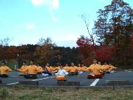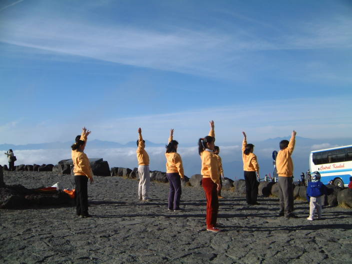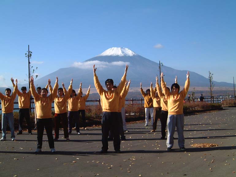 【明慧网2000年11月23日】 在世界各地同修努力向世人说明真相的今天,日本法轮大法弟子也在积极采取各种各样的方式洪法与讲清真相。  2000年11月19日星期天,来自日本东京、琦玉县、神奈川县等地近二○位大法弟子相约驱车前往正值红叶季节的旅游胜地富士山洪法。距离较远的几位凌晨四点半即披星戴月启程赶往集合地,轿车飞驰在高速公路上,星月渐渐隐去,黑幕越来越深,学员笑曰∶真是黎明前的黑暗呀。到达高速公路的神奈川县海老名市休息处,大家稍事小歇,马上打开录音机,跟随着师父的口令炼功。身着金黄色写有法轮大法、真善忍棉毛衫的同修们的优美舒展的动作吸引了许多来此休息的行人的目光。 各地的同修聚齐了一看,大家都不约而同在车的前后车盖上或窗上贴上了法轮大法、真善忍的标志。小车队继续上路,带着法轮大法的福音一路奔向富士山。 天渐渐亮了起来,乌云却也慢慢挤满天空。有的同修不禁担心天这样阴下去甚或下雨,富士山一带旅游者势必大减,那我们洪法效果也必受影响。另一同修说,我们修炼的人做什么事,特别是大法的事,只要怀着善念,纯纯净净地去做,不抱有任何观念就会做好!是啊,“做而不求――常居道中”,师父不是早就给我们说清了怎样去做了么? 汽车继续前行,突然闻听一声呼唤∶“快看,富士山!”只见四周厚厚的乌云之间,头顶皑皑白雪的富士山直耸蓝天、雄伟壮观兀现眼前。九点多钟当大家赶到富士山脚下的山中湖已是阳光灿烂,富士雄姿倒影湖面,碧波荡漾,湖光山色,正是“一潭明湖水,烟霞映几辉”。大家沿着湖边,边发报纸边找寻合适的炼功地。很快十几位学员在湖岸沙滩上展开大法真相图片和资料炼功,几位学员分发法轮功真相报纸,有两位学员直接投递到当地居民住宅的信箱。在我们的炼功队伍前各种车子,包括好些观光大巴士一辆接一辆开过,还有约两百人的大型观光团经过,只听他们惊喜地声音∶哟,这里也有法轮功!并主动和学员招呼、询问和鼓励。 炼完一遍动功,有学员建议∶我们到富士山腰的登山口五合目观光点,那里游人更多。驱车登高,处处红叶的阔叶林,苍翠挺拔的针叶林……渐次被抛到脑后。登上海拔两千多米的五合目,远处群山起伏,脚下云海翻滚,红尘喧闹顿消,宛若天上仙境。摆好图片和资料,炼功音乐也随即响起。醒目的金黄服装、优美的音乐和炼功动作,立即引起游客的兴趣和注目。许多游客接了我们递上的大法报纸,有的当场就从头到尾仔细阅读,有些游客以我们炼功队伍为背景拍照,有的仔细观看图片。 有一位台湾来的客人马上前来询问有关法轮功的事情并表示要学,还要了台湾的炼功点地址。在我们炼功时来了好几辆大巴,其中有两辆是中国旅游团的,一下车看见学员,有的说“你们还炼法轮功啊?”我们就耐心告诉他们∶在世界40多个国家、地区,甚至中国的香港、台湾和澳门,人们可以自由修炼法轮功,法轮大法在世界各地获得了40多次褒奖。只有在中国大陆现在依真善忍修炼成了罪。已知就有80多位大法弟子被残酷迫害致死。有一半以上同胞接了我们送的大法报纸,有个别害怕不敢接的,说:这个我看不懂。我们学员知道他说的是什么可还是微笑地告诉他:欢迎了解法轮功真相,有中文的。有些同胞走过来看图片,边看边说:法轮功?有辆大巴就在我们图片展前下车……山上虽然很冷,但洪法效果很好。学员们说有时间我们应该多来才是。 正法进程到今天,大家都认识到作为大法的一粒子,在这个时候就要发挥一个粒子的作用,就要使自己这颗粒子发出纯正的光芒来。