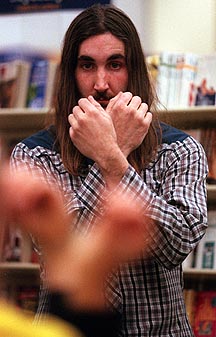 周三晚上,在Books-A-Million举行的法轮大法免费学习讲座班上,伊万斯维尔市的约翰·巴格正跟随着义务教功的法轮功学员劳拉·斯班炼习法轮功动作。