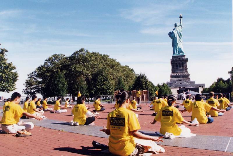 【明慧网2000年9月7日】世界日报:法轮功学员发动大规模请愿在江泽民下榻饭店等六处集结练功 纽约市府出动大批警力维持秩序 2000年9月7日 【本报纽约讯】来自各地的法轮功学员及旅美藏人,五日晚上分别在江泽民下榻的曼哈坦华尔道夫大饭店进行「练功请愿」与示威抗议,合计人数超过千人。纽约市警方出动大批警力维持秩序,示威叫喊声几条街外都听得见。这是江泽民抵达纽约后,华尔道夫饭店前的第一场大示威。 法轮功学员昨天有计画、有组织地在全纽约市分批展开大规模的集体练功请愿活动,每处场地都超过三百人,总人数估计有一千八百人。活动地点从联合国对面广场、中国大陆驻纽约总领事馆、炮台公园、自由女神岛及曼哈坦华埠、布碌仑新华埠八大道,一直到皇后区法拉盛等处。华尔道夫大饭店也是法轮功成员请愿示威点之一。晚上七时,藏人开始集结,加上已在现场的法轮功成员,人数越来越多,两组人马同时被警方赶到饭店对面进行活动。 据指出,这次前来纽约参与请愿示威的法轮功学员分别来自英国、奥地利、澳洲、瑞士、法国、丹麦、芬兰、西班牙、比利时、加拿大、泰国、台湾及美国各地。 昨日纽约市上空还出现一架飞机,拉着一面写有「中国:给法轮功自由」(China:Free Falun Gong)的英文横幅,在以联合国、中国大陆驻纽约总领事馆及自由女神岛等主要场所的上空盘旋。法轮功学员们则一早就在距江泽民下榻的华尔道夫饭店一街之隔的咖啡馆举行早餐会,宣传法轮功。其时江泽民也正在饭店内与美国各主要媒体负责人举行早餐会。 上千法轮功学员昨日还在曼哈坦南端的炮台公园练功,向路人派发宣传法轮功遭到不公正对待的资料。约七十多位法轮功弟子并乘渡轮前往自由女神岛,在自由女神像下练功(见图)。法轮功弟子提出的诉求包括:还法轮大法清白;撤销对李洪志先生的通缉令;释放所有被关押的大法弟子等。