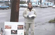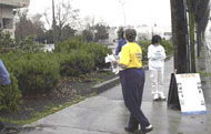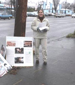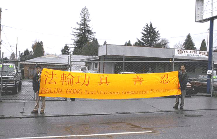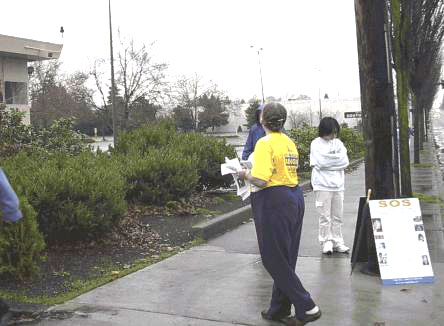 | 【明慧网2001年11月27日】闻旧金山领事来波特兰市,学员们都觉得不能错过这个机会。 一大清早便赶到,天空中飘着蒙蒙细雨。 修炼才三个月的西人学员在赶做36位西人学员护法宣传板时开玩笑地说:“这是我做的第一块宣传板,这将被载入历史。”西人学员R在冬天的毛毛雨中穿着短袖黄T恤向华人发着真相资料,她说她浑身发热,只是手略冷。当我们对人们说“法轮大法好”并递给他们资料时,大部份人都要。说广东话的学员还操着广东话并给他们广东话的真相录像带。学员Y连夜写了请愿信并亲自去递,可领事和工作人员拒绝收学员的信。一个上午来了很多人,都幸运地得到了一份真相材料。    |