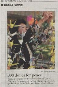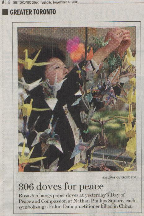 【明慧网2001年11月7日】2001年11月3日,星期六,多伦多的修炼者们在市政厅前为多伦多的社区举行了一次“和平与爱心日”活动以歌颂这些令我们的世界变得更美好的特性和价值。据市政厅工作人员说,虽然天气寒冷,仍有1000多名多伦多居民和外来的旅游者参加了欢庆节。几家主要媒体,包括多伦多星报,都对此做了很好的报导。多伦多星报的一名记者和一名摄影师在那里停留了数小时,享受着音乐节的快乐。下面的照片是修炼者们做的306只纸鸽子,每只代表了一位在中国被迫害致死的法轮大法修炼者。然后,几十只真的和平鸽飞上了天空,以纪念那些带着坚定、和平与尊严献出了生命的修炼者。 下面这张照片刊登在多伦多星报11月4日A16版上:露沙.金在昨天的“和平与爱心日”把纸鸽子挂在那森.非力普(Nathan Philips)广场,每只鸽子代表着一位在中国被杀害的法轮大法修炼者。