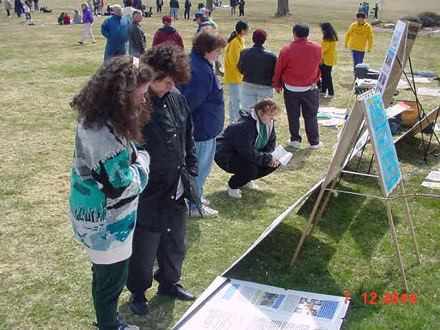 早晨10点,庆祝活动以十几个功派的联合大炼功拉开序幕。各个功派都着各具特色的T恤或炼功服。我们站在方阵的最外围做法轮桩法。接着是主持人发言和各功派各显其能的功法表演。终于是切磋交流的时间了许多人迫不及待地来我们这里学功。我们的摊位设在古老庄园的脚下,学员们不停地演示着五套功法。几乎每一个来宾都不由自主的被法轮大法优美祥合的功法和彩色的展牌吸引,来学功的人络绎不绝,三四个学员一刻不停地教着功,另外一些学员专门解答问题,许多人当时就想买书及教功带。 一位太极教师早就对法轮功心向往之,他几次离开自己的摊位来找我们学功交流,最后与一位学员约定去他那里教功才满意离开。 两位刚得法的西人学员高兴地得到了动作的纠正。 讲真相是洪法不可分割的一部分,我们也选择设置了一些揭露邪恶迫害的展板,许多人看了并听了学员介绍后都在给联合国的求诉书上签了字。 一位学员约了几位朋友来参观,他们都对有如此多的西方人对法轮功感兴趣留下了深刻印象,也都乘兴一起学了法轮功功法。一位朋友刚从国内来一直在练其它气功,看了资料学了功法后,说回家要马上找一本<<转法轮>>来看。一位朋友9岁的儿子从没学过动作,却一直帮忙发报纸还和我们一起集体炼功,俨然一副老学员的样子。 下午4点,活动该结束了,可很多人还是意犹未尽...... (康州学员供稿) |