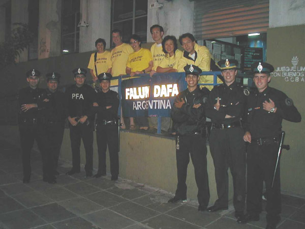 【明慧网2001年4月14日】 法轮大法学员在阿根廷的布宜诺斯艾利斯(Buenos Aires)举办数天的讲座,以向当地人民介绍法轮大法,并澄清中国迫害法轮功的真象。在当地公园和社区中心有大约100人学习了功法。学员们发现阿根廷人民心地非常好。人们热情,友好,而且很急于了解大法。一天下午在一个公园教功时,有六名警察经过。其中一位警察走近学员问,"我们怎样才能最好地为你们服务?"当地一名学功的女士讲这令她难以置信,"在这个公园里你被抢劫被殴打都不会找到一个警察!为什么这么多警察来到炼功点?我从来没见过这样的事情!" 当天晚上,在一个当地的社区大厅教功时,大约有13位警察前来"保护我们"。学员们笑着开始和警察分享法轮大法的诸多益处。警察很高兴,并很快就看到学员们表现出来的善心。他们面带微笑,高兴地帮助引导人们进入社区大厅去学习法轮大法。 大约有40个人参加了学习班,在学习班成功结束后,警察同意和我们集体留影。他们解释说他们被派到这里来是因为中国方面表示的关注,因为他们的江主席也在布宜诺斯艾利斯。我们感谢他们非常友善地来"保护我们",而他们回到家中时已经从心里明白了法轮大法好。 大法学员 2001年4月9日于南美 |