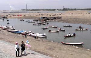 ***** 松花江遭遇罕见枯水期 上图:江底裸露的松花江因天旱少雨,哈尔滨段松花江部分江底裸露,江心沙滩明显凸出。据水文专家讲,如再无较大降雨,春夏交替期松花江平均水位将低于历史同期最低水位20厘米左右。 记者:周确摄 来源:新华社 日期:2001-05-30
