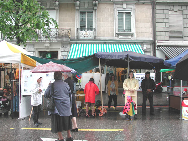 【明慧网2001年6月16日】 6月9日,在瑞士福利堡(Fribourg)的一条主要街道上,有一大的集市,这自然是我们洪法的好机会。师父在《建议》经文中说:“未来人还要得法,世上几十亿人等着这场邪恶被法正人间时除尽后得法”。为完成这一神圣而又伟大的历史使命,我们必须时刻“以法为师”更加勇猛精进,坚持不懈地“用理智去证实法、用智慧去讲清真相、用慈悲去洪法与救度世人”;我们必须从我做起,走出去洪法,去结缘,让更多的人了解大法,接近大法,修炼大法;同时揭露“人权恶棍”江泽民之流的残暴与邪恶。让更多的人了解真相,真正起到大法一个“粒子”的作用,以实际行动助师世间行。 这一天,虽然下着大雨,但瑞士的大法弟子们怀着崇高的目的以一颗纯净的心,带上几种文字的大法资料不约而同地从四面八方奔向福利堡。有的来自世界名城日内瓦,有的来自首都伯尔尼(Bern),有的来自边界城市巴塞尔(Basel),有的来自…… 到达福利堡之后,大法弟子自觉而有序地开始了洪法活动。有的搭避雨的帐篷,有的摆放法轮功的展示板,有的发材料,有的为游人解答问题,有的讲清真象,有的演示动功,有的写书法。在摊位前,很多游人驻足观看以书法录写的“真、善、忍”;“佛光普照,礼义圆明”等条幅。当他们一一问清了其内涵之后,都纷纷索取,并对我们免费奉送表示谢意。有的自己得到一份之后还为朋友索取一份…… 更令人感动的是,在我们将要收摊时,来了两个七、八岁的小朋友,一再要求说,他们喜欢“真、善、忍”,每人要一份,还给另外的小朋友要一份。当他们的要求得到满足之后,高兴的蹦蹦跳跳的离开了。望着他们离去的背影,这位大法弟子自言自语地说,他们真有缘份,说不定他们将来会成为大法的中坚。 在大法弟子中,有老弟子也有新学员,有位新女学员带着两个孩子,大的三岁,小的只有四个月,也冒雨赶来参加洪法;有的学员把大法资料放进自己的怀里,宁肯自己淋湿也不让大法材料受潮,逐一发给游人,那情景很是感人。 还有一件奇妙的事情令人感叹! 在我们洪法摊位的对面,是一个舞台,上面一位男高音通过麦克风在自弹自唱着,那声音之大,频率之高,足以使潮湿的空气震颤。不仅大法的音乐听不见,连演示炼功也无法进行。大家都明白干扰背后的内涵,几乎同时所有弟子都不约而同地发出了正念:“法正乾坤、邪恶全灭”,霎时音乐骤停,歌唱家怏怏离开,一边走一边连称奇怪。正如师父所说,“大法弟子的正念是有威力的”。直到我们收摊往回返的时候,那两个高音大喇叭才又响了起来,弟子们都会意地笑了。 当弟子们随着炼功音乐演炼动功的时候,有两个七、八岁的小女孩,跟着大法弟子的动作,从容并认真的炼了起来,直到四套动功炼完她们才高高兴兴地离去,她们真有缘份。 当大法弟子们分手握别的时候,脸上都带着灿烂的笑容,高兴的说,今天真好,把带来的那么多大法的材料,全部发完了。 |