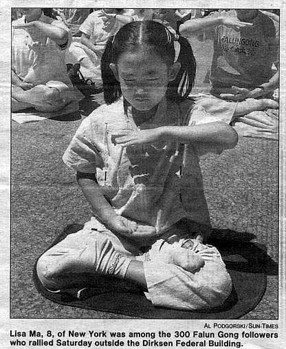| 【明慧网2001年6月28日】2001年6月24日太阳报记者(SABRINA WALTERS)报道-- 唐健在这个星期六哽咽着讲述了她在中国是如何遭受折磨的,她脚被脚镣禁锢着,鼻子被捏着,被一个狱监强行灌盐水时,她开始呕吐。 “拘留中心的一个负责人踢我的胸部,当我拒绝进食时,他命令给我强行灌盐水。”唐在300名左右的法轮功追随者面前证实了这一切。法轮功是一个把宗教和打坐结合在一起的一种精神运动,并已被共产主义国家的中国禁止。 聆听她故事的抗议者强烈要求中国停止这种迫害。他们在芝加哥的市政联邦大楼的广场上集会,在密西根大道上游行,并在中领馆面前坐下,为他们的家乡--中国的法轮功成员表示支持。 追随者们说,自从1999年法轮功被镇压以来,那些不遵从政府命令停止炼法轮功的人遭受了残酷迫害。根据美国政府以及国际人权机构的信息,法轮功成员确信已有超过200名忠实的成员被迫害致死,象唐这样的成千上万的炼功者被关进监狱和拘留中心,并有几百被投进精神病院。 本地的中领馆发表声明说:“中国政府做了一个有责任的政府应该做的。”... 法轮功把自己描述成一种精神的运动,着重于通过锻炼并遵循创始人倡导的“真善忍”以得到健康的生活。 唐是从一个广州的朋友家里被拖走的,后在国会的强烈要求下被释放了。她说她在一个肮脏的监狱里度过了15天,“那里时常有老鼠跳到我们身上,他们给我们吃的是腐烂的米及蔬菜。” 中国城国际银行分部的总裁沃轮.戴先生星期六也参加了抗议,戴责备了中国因恐惧而镇压:“当他们不能控制你的思想时,他们害怕了。”  照片:300名法轮功成员中的丽莎.马,8岁,来自纽约,在市政联邦大楼前 |