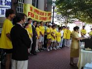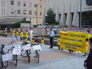 7月13日,这是他们北上以来第一次住在学员家里,他们感到轻松愉快。整个上午没有日程安排。他们利用这个时间学法炼功,互相交流。尽管每天骑车时他们可以听师父的讲法录音带。象这样安静下来学法炼功还是第一次。 下午,车队的学员参加了当地学员主办的记者招待会。当地的媒体前来参加了记者招待会并访问了当地的学员。记者招待会后学员们一起绕着州政府大楼进行了紧急救援走步。 半晚,当地的学员们又把车队的学员们送到US1上。和当地的学员们分手后,车队继续北上。