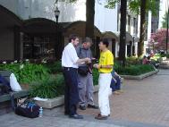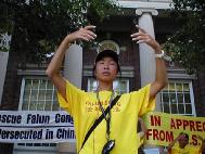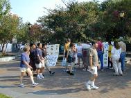 七月十五日,德州SOS队伍在新奥尔良市展开了第二天的紧急救援。我们的呼吁地点选在了该市最繁华的地带。在匆匆过去的一天中留下颇多的花絮。 (一)今天早上因为没有安排好时间,以至于在走错路的情况下迟到了。摆展板时发现夹子、签名板都留在车里,搞得措手不及,周围的环境也感觉不很和谐。学员意识到自己心性上的问题,及时纠正。巧的是虽然晚到了,我们却在互相打探路的过程中巧遇电视台记者并同行到达目的地。 (二)采访刚开始,就有一个卖艺的人在我们前面弹琴高歌。学员发正念时感到心态不纯,卖艺人唱得更起劲了。后来一个学员悟到:我们应该去用真正的善心向他讲真象。当一位学员过去和他讲清真象之后,他变得非常支持我们,并签了名。 (三)新闻发布会的对面是大游轮,游客上上下下,热闹非凡。包括当地NBC,CBS,FOX及最大报纸--皮堪邮时报在内的媒体参加了发布会。在正式发布会之后,一位学员灵机一动:向对面整船的游客开"新闻发布"。那庄严的场面震撼了在场的每个人。每个人都在用心倾听学员的发言和受迫害的经历,空气凝住了… (四)在摄影记者拍摄炼功场面时,一群孩子跑过来抢话筒捣乱。学员们心生慈悲。正念一出,孩子们立刻停止了玩闹,并认真地学起功来。 (五)上午发传单时走过来一个傻子,突然在迫害致死的学员照片前站住了,非常认真,仔细地上下寻找着什么。我走上前递给他传单,他高兴地傻呵呵地笑。世人啊,你们真的聪明吗?那看似精明的正常人还不如一个傻子。 (六)一位妈妈领着两个孩子在展板前驻足良久。孩子天真地问图片上的学员怎么了,当被告诉是江泽民流氓集团指使下的恶警所为时,他们瞪大了眼睛…妈妈愤怒地说:‘这太可耻了!”“孩子,你们要记住:你应该为你所在的国家感到骄傲。”