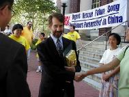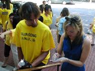 7月13日,大芝加哥地区数名法轮功学员组成“SOS紧急救援”小组从中领馆出发,将开车东行10余个城市(基本是中小偏远无大法弟子的城市),介绍大法、举办新闻发布会、讲述法轮功在中国遭受的迫害并征集签名。 当晚学员们在印第安纳州的一个小城图书馆举办义务教功活动,其中一位学员到附近商店、咖啡馆等地征集签名,淳朴的小镇居民在听完大法的介绍和所遭受的无端迫害之后纷纷伸出援救之手,或要求多保留一些资料以告诉更多的人,或严肃郑重的签下自己的名字。有趣的是,第二天当学员们到达密歇根湖边的一个沙滩上展示功法并征集签名时,一位女士刚一看征签信突然指着一个昨天刚在一家小咖啡馆里征集来的签名说:“天啊,这是我住在那个小镇的哥哥!他都签了,我也签!”并回身从周围叫来了自己的一大家子人,从4、5岁的小孩到爷爷奶奶约十余人纷纷围着签版,惊讶于自己远方的亲人居然也出现在同一张征签信上,尤其在听完学员的讲述后,纷纷都签上了自己的姓名,一张纸一下子就被这一大家子人占满了。学员们从内心里为他们感到高兴,感谢师父的安排让大法和这善良的一家人结下了缘份。 有一对老年夫妇在询问了许久以后,不仅索取多份材料,还要了一张空白的征签表格,说要让周围的亲朋好友都知道真相,都来签名并直接寄给中国总理朱镕基。还有一位女士说:“我是一名虔诚的基督教徒,我虽不会练功,但我会写信给中国政府,告诉他们信仰自由!” 14号学员们继续东行到达一家图书馆举办义务教功活动,一个来还书的人一看到横幅就又惊讶又兴奋的说:“我找了你们好久了,我对法轮功特别感兴趣,我自己买了书和教功录像带,可惜周围地区都没有练功点,只好自学,今天你们居然来了!”她认真的让学员纠正了动作并交流了很多,真没想到在这个小城市会碰到这么一个有缘人。 15号学员们到达印第安纳州中部的南班得市,在当地警察的热心帮助下,很快就联系了NBC地方新闻电视台,编辑记者们在听完学员的介绍后,仅十分钟就一切就绪采访了学员并要求演示功法,并在当晚5点和10点的新闻播出,起到了非常好的洪法和讲清真相的效果。