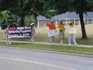 (二)途中 第一天(7月11日)傍晚,大法弟子来到了途中第三个城市剑桥(Cambridge)。 第二天(12日),我们离开剑桥,一直沿着人烟稀少的乡村公路向哈密尔顿(HAMILTON)迈进。弟子们在经过路边的邮箱时,将法轮功的真相留给那里的人。途中,两位住在哈密尔顿的加拿大人在上午去剑桥的路上见过我们,当他们在返回哈密尔顿时,看到大家已经走在了福兰般若(Flamborough)镇。他们被深深吸引并走下车来,加入到我们的行列,一边走一边更多地了解真相。大法弟子在邪恶迫害下所表现的大善大忍启发了哈密尔顿人的善心,表示回去后要告诉人们有关这次世界SOS救援活动,并帮助通知媒体我们第二天在哈密尔顿的活动。 第三天(13日),我们来到哈密尔顿市政府大楼。加拿大CH电视台记者刚完成向路人采访有关奥运话题,正准备装车打道回府,这时迎面走来的请愿者吸引了他。看到横幅上醒目地写着“紧急救援中国法轮功学员”(SOS!Urgent Rescue The Falun Gong Practitioners Persecuted in China),他立即重新在车中取出采访器材。平时一向腼腆的小弟子唐圣,面对着镜头向当晚电视机前的无数加拿大观众敞开心扉,揭露了中国大陆邪恶势力对法轮功的残酷迫害,呼吁广大人民紧急救援,制止迫害。 机会无求自得。途中经过哈密尔顿市最大的报纸Spectator的报社门前,刚巧主编从里面出来,询问了法轮功的情况并引大家到城市新闻处预约了第二天的追踪采访。 第四天(14日),队伍来到下一个城市博灵顿。由于周末,凯吉纳-滑铁卢的更多学员加入了行列。Spectator的记者沿着我们的路线,从后面赶了上来。在约半小时的采访中,弟子们全面的向其提供了法轮功真相,他带着宝贵的事实满意而归。 经过数天来的奔波,学员克服着疲惫,浑身酸痛疼和脚上起泡的痛楚,洪法之余更抓紧学法,炼功,交流,正念除恶。明慧网的一篇国内大法弟子为了给海外弟子加油的文章“漫长的国道上只要是在走路的,全都是大法弟子”,有力地鼓舞了我们。