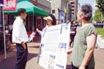 【明慧网2001年8月19日】 图一:法轮功学员徐慧(右一)、杜明娜(右二)手持海报沿途解说「法轮功」,民众均表示同情及支持。(本报记者刘美玲摄)