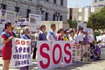 图二:大纽约地区法轮功学员高举「SOS」海报,十六日自州议会徒步至翠登市市府。(本报记者刘美玲摄) 世界日报8月18日新泽西报导,为抗议北京政府持续镇压法轮功学员,及声援前年返回中国被判刑三年的学员滕春燕及其他遭到迫害者,大纽约地区法轮功学员十六日前往新州州议会前,吁请州议会及美国国会正视中国大陆残暴对待和平修练的法轮功学员的问题,他们也在翠登市街头散发传单,获得不少民众的关心。 大纽约地区的数十位法轮功学员十六日手举「 SOS 」海报,从州议会一路游行至翠登市市府大门前,学员们一路散发传单,不少接获传单或看到游行海报的非华裔民众说,从电视新闻看过法轮功学员遭到中国政府迫害的新闻,他们一心寻求自由和平却被政府打压的遭遇令人同情。 随后在州议会大门前召开记者会,吁请州及联邦议员向中国大陆抗议非人道对待法轮功学员的行为,会中并指控中国国家主席江泽民是亲自下令造成至今超过二百六十位法轮功学员遭到刑求致死的刽子手。 他们指出,中国大陆的马三家劳教所内的一百卅名法轮功学员,正以静坐禁食抗议官方非法囚禁。 住在新州的陈缨偕同父母陈汝棠、陈凝芳到场,为现正关在中国劳教所内的弟弟陈刚请愿。去年六月曾与儿子一同被捕拘押一个月的陈凝芳指出,被关在北京近郊团河劳教所内的陈刚被判刑一年,一年来儿子坚持不肯签字接受感化,今年六月廿五日原可以出狱,但劳教所一通电话,说要再延长六个月,每天思及儿子的处境令她担心。 不时落泪的陈凝芳说,儿子从小听话,也从没犯过什么大错,“唯一的错”大概要属几年前开始修练法轮功,但是练法轮功对他的身体好,他在劳教所内坚持不签字也是对自己诚实,她不懂官方究竟认为法轮功有什么不好。 当天国会议员史密斯、费格森均派代表与会支持,州众议员贾西欧拉到场,严声谴责中国政府非人道对待法轮功学员的行为,并颁发褒扬状给上个月步行二百五十哩前往华府为法轮功学员请愿的曹健,以及日前在中国劳教所内不堪狱方刑求,辗转自香港逃至美国的覃永洁,不过覃永洁当天未出席。