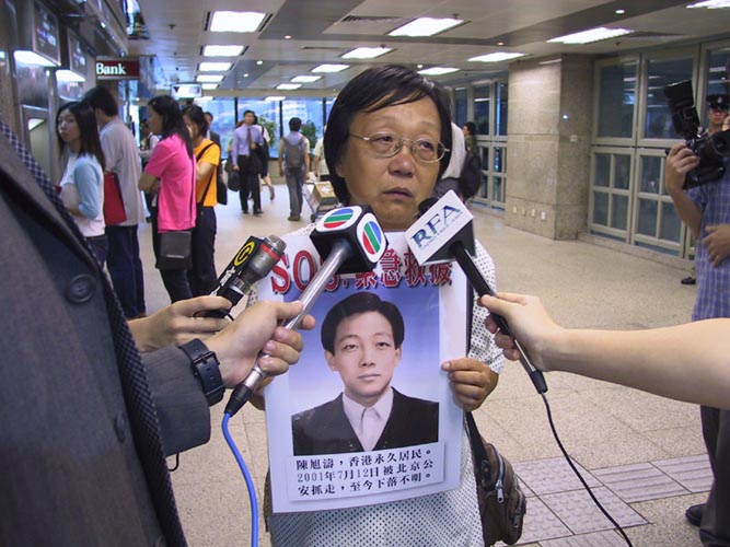 陈旭涛的母亲刘玉玲手持照片呼吁港府营救她的儿子。
