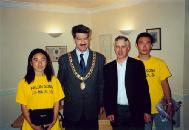 【明慧网2001年9月15日】本来我们要打算去另外一个郡,可是芭芭拉修女告诉我们克拉凯尼镇正有个艺术节。于是我们决定改变主意去克拉凯尼镇。 |  | | 接受电台采访 | 和克拉凯尼市长、汤米.柔敕先生在市政厅合影 |  |  | | 和约翰.米基尼斯议员、汤米合影 | 在街上洪法炼功 |