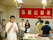 【明慧网2002年10月14日】近日,联合国难民署批准认定日本6名法轮功难民申请者为联合国难民。2002年10月5日,法轮功难民申请者举办了“祝福与感谢”联欢晚会,答谢这一年多来给予难民申请者支持和援助的各界人士,同时恭贺法轮功难民申请者支援会筹备者之一,大赦国际的北井大辅先生新婚之喜。晚会在东京茗台生涯学习会馆料理制作室召开。      秋日的东京,没有一丝凉意。一大早大法弟子们就赶到了会场,准备工作有条不紊地开始了。与平日里大法弟子不辞辛劳繁忙地讲真相、和发正念单手立掌时的威严不一样,在这里大法弟子一展新的风貌―――个个都是富有生活情趣的多面手。他们亲手制作了的各种各样的具有中国特色的菜肴和水饺。会场布置得温馨而喜庆。 与会者来自大赦国际日本支部,联合国难民署日本高级专员事务所,日本难民支援协会,法轮功难民申请者律师辩护团、法轮功难民申请者支援会,宗教新闻社及东京大法弟子等欢聚一堂。 主持人首先向来宾表示了感谢、感谢他们在这一年多来给予难民申请者的援助及对在中国遭受迫害的法轮功所给予的理解和支持。继而宣读了法轮功难民申请者支援会发起人之一、众议院议员牧野圣修先生寄到晚会现场的、对北井先生新婚的贺词,并转呈了贺礼。 法轮功难民申请者支援会会长,东京工业大学广濑教授,律师团团长鬼束律师以及日本法轮功协会代表鹤园先生及各团体的代表分别致词祝贺。 一幅精制的由大法弟子撰写的篆体“缘”字的书法作品表达了难民申请者对新婚夫妇的祝福。寓意昨日的因缘、今日的良缘、明日将会有更美好的缘。 法轮功学员为晚会特别制做了纪念贺卡。封面是另外空间的荷花及“世界需要真·善·忍”的汉字。封底是一首汉语诗《缘起》:“高朋共聚主宾亲,佳期双庆意更欣。礼轻缘重心相会,环球同庆待来春。”令来宾爱不释手的小小卡片把与会者的心溶为了一体! 大法弟子为晚会连夜赶制的录像片“正义与良知”更是把会场的气氛推向了高潮。律师们在准备向入国管理局递交迫害材料的镜头,难民申请者支援会邀请澳洲画家章翠英女士在东京举办画展开幕式的场面,以及律师团和支援会联合举办的难民申请记者招待会的实况等等,真实地纪录了这一年多来为帮助难民申请者,这些正义、善良之士所付出的巨大努力。与会者无不为之感动。 最后金子容子救援会会长北岛先生向大家汇报了现在金子救援活动的进展,并呼吁更广泛的支持和援助。大赦国际日本支部的几位与会者以个人身份向难民申请者支援会捐款以示声援。 晚会以一首大法弟子作词作曲的歌曲“得度”作结束。大法弟子领唱,与会者合唱,由海外来联合国大学就职的一名法轮功学员吉它伴奏。优美的旋律久久地回荡在每个人的心田……