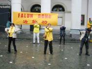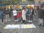 【明慧网2002年10月29日】为了配合大法弟子在美国的正法行动,欧洲的大法弟子在布鲁塞尔开展洪法讲真相活动。  十月二十五日大法弟子在位于市中心商业区的皇家剧院广场向过往行人讲真相,并定点集体发正念。虽然阴雨连绵,许多行人仍然被大法美丽的音乐、优美的炼功动作所吸引,从而驻足观看。大法弟子向他们递上真相传单,他们都很乐于接受。有些人和大法弟子交谈,详细了解法轮功以及遭受迫害的情况。正念使周围环境充满祥和。路人都感受到了这纯正的场,脸上闪烁着愉悦的笑容。 入夜,星星点点的烛光映照着遇害弟子的照片,大法弟子们静静地开始了守夜。这是对死难同修的哀悼,是对邪恶镇压的无声抗议,也是对善良世人的呼吁,呼吁他们与我们共同努力,制止这场摧残人性的邪恶镇压。 两位中国游客经过广场。他们立刻被守夜的场景吸引,并与几名中国大法弟子攀谈起来。他们很善良,并对大法有一些了解。他们认为这种迫害是完全无理的,人们应该享有精神信仰自由。 随着弟子们不断的讲清真相,发正念清除另外空间的邪恶因素,越来越多的善良人在觉醒,并给与我们不同程度的支持。