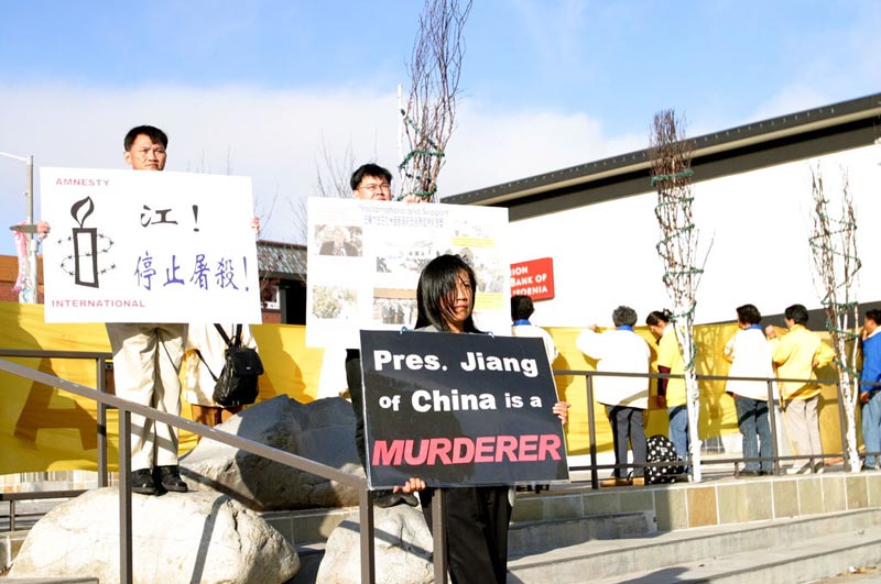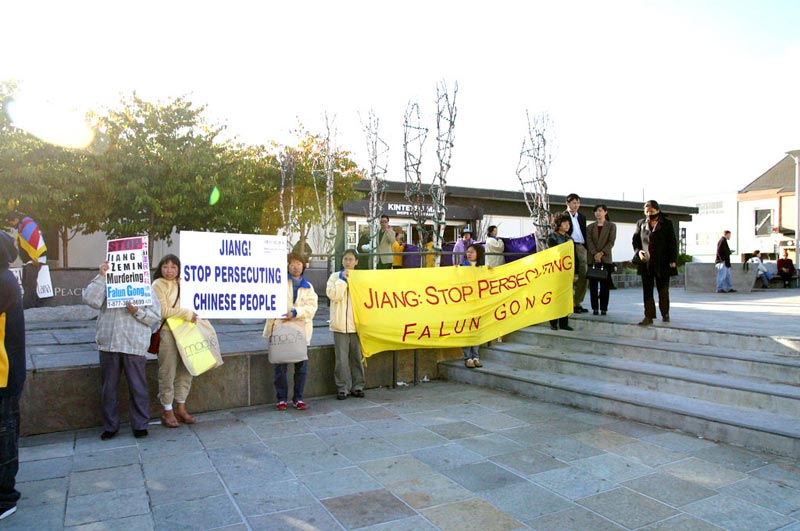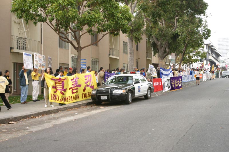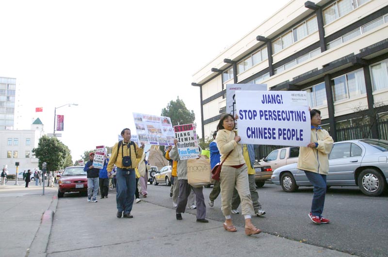 【明慧网2002年10月31日】10月28日,据媒体报道迫害法轮功的元凶首恶江XX美国之行的最后一站是旧金山,来自新加坡、台湾、南加州和北加州等地法轮大法学员汇集在旧金山中国领事馆前,要求江XX集团立即停止对法轮功的残酷镇压,并呼吁社会各界正义之士行动起来共同制止这场迫害。