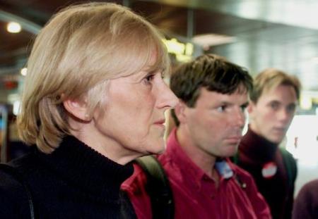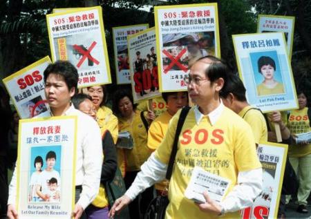 图:2002 年3月10日,星期天,在香港市区街道,香港人欧满乾(音译),左,同他的两个孩子举着他妻子吕柏凤的相片和一个上面写着“释放我的妻子,让我们家庭团聚”的牌子。星期天,一组法轮功炼习者在繁忙的街道上平静地游行至中国驻港办公室,请求释放两名香港法轮功成员,包括上个月在大陆被拘捕的吕柏凤。(美联社图片 Lo Sai Hung)  图:2002年3月8日,星期五,前澳大利亚奥林匹克获奖者简.贝克,左,同另外两个澳大利亚法轮功学员与记者在新加坡樟宜机场谈话。星期四,她同另外九人在北京举行了一个简短的抗议后被扣留。贝克说,国际奥林匹克委员会错过了在2008年奥林匹克比赛之前强迫中国(江泽民)政府改进他们人权纪录的机会(美联社图片Ed Wray) (英文版:http://www.clearwisdom.net/emh/articles/2002/3/14/19819.html) |