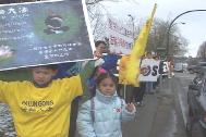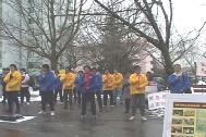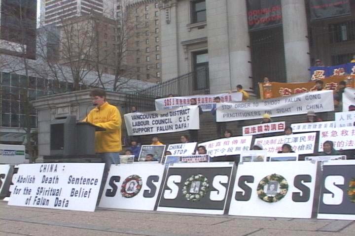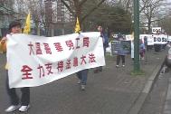 【明慧网2002年3月21日】温哥华学员继两天绝食后,把紧急救援活动推向又一个高潮。3月19日,温哥华学员集中到市中心,首先在中国城集体炼功,发正念,向路过世人讲真相,发传单,尽快把江泽民“杀无赦”的恶令告诉世人,唤起世人的善念与良知,更好地救度众生。中午,我们从中国城开始游行到市中心艺术馆,在这里又集体发正念,炼功,并举行新闻发布会。