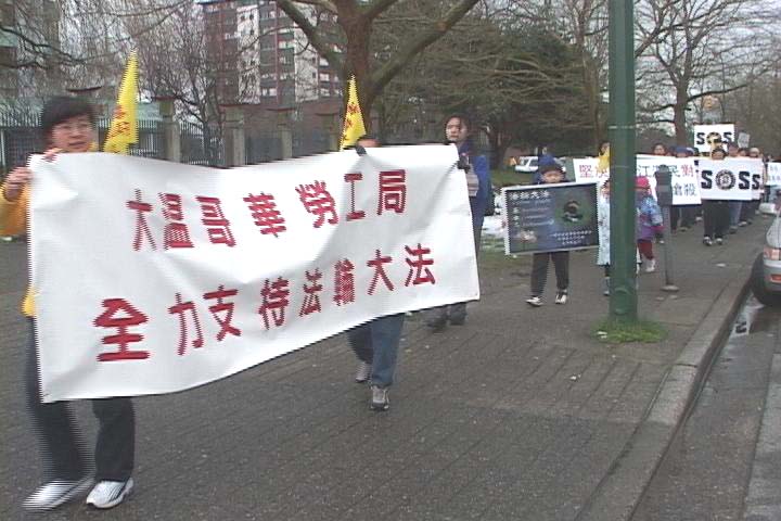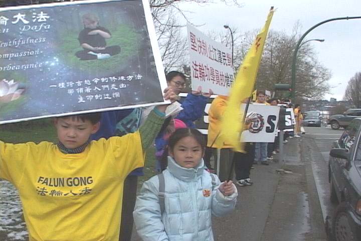 许多人了解了真相后都谴责江泽民政府的暴行,表示了对法轮功的支持。一个来自北京的国家干部说:“其实大部分中国人心里都明白,法轮功好,中国政府的镇压是错误的。你们放心,法轮功一定会平反,你们在国外好好炼。”今年温哥华气候反常,三月份以来已两次下大雪,天气阴冷。18日还是大雪纷飞,预报19日仍有雨雪,可是学员们没有退却,仍然按原计划进行,同时发正念。奇迹出现了,在我们大法活动的5个多小时里,竟然一点雨都没下,午后一段时间居然还露出了淡淡的阳光。可是在我们活动结束后约一小时,雨夹雪又下来了。我们心里都明白,慈悲的师父时时刻刻在看护着弟子,只要我们的念正,我们就心想事成。 (英文版:http://www.clearwisdom.net/emh/articles/2002/3/22/20144.html) |