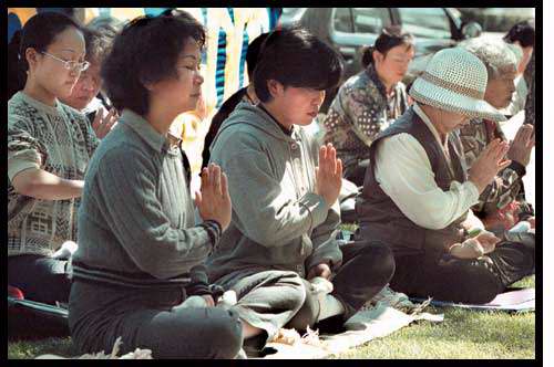 【明慧网2002年3月22日】 图片:法轮功学员在位于沙托街(Shatto Pl.)的中国领事馆前发正念、炼功。帕萨迪那星报(Pasadena Star)2002年3月20日洛杉矶讯,十一人为抗议中国对法轮功学员的虐待,举行了为期三天的绝食,于周三在中国领事馆前以炼功形式结束了这次活动。 六十一岁的阿尔汗布拉居民李延(音译,Yan Li)通过翻译说,法轮功的打坐功法支撑着他完成了绝食全过程。报导说他指法轮功极大地提高了他的健康和道德水平。 报导说李和其他绝食者们与大约12名抗议者一道,静静地坐在领事馆大楼前的草坪上打坐。许多人举着牌子呼吁中国停止对法轮功的查禁。 一个牌子上写着“停止谋杀”,另一个牌子上用中英文写着“法轮功好”。 报导说法轮功追随者们通过修炼提高精神境界。中国(江)政府于1999年将其查禁。 罗斯密德居民,在加州理工大学工作的32岁的苏茜-楚昂说:“在这场迫害中,因遭受暴力和酷刑折磨而在(警方的)监禁中死亡的人数,已经证实的就已有381人。”楚昂是越南人,在南加州长大。 她和其他绝食者绝食绝水3天。抗议者们说,他们组织这次绝食是因为据称中国主席江泽民下令可以对法轮功追随者处以死刑。 楚昂说:“我们的绝食抗议也是要为最近在香港被释放的法轮功修炼者讨回公道。”她是指上周在香港因抗议而被逮捕的法轮功修炼者。 报导引用她的话说,“我们要求停止迫害和谋杀。”