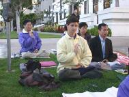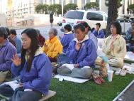 【明慧网2002年4月27日】四月二十五日,为纪念万名法轮功学员北京和平上访三周年,洛杉矶学员从早九点至晚九点,在中领馆前进行了连续十二小时的请愿活动。学员们每个整点都发正念,中间穿插着炼功和向过往行人及来办签证的人发送真相资料。
